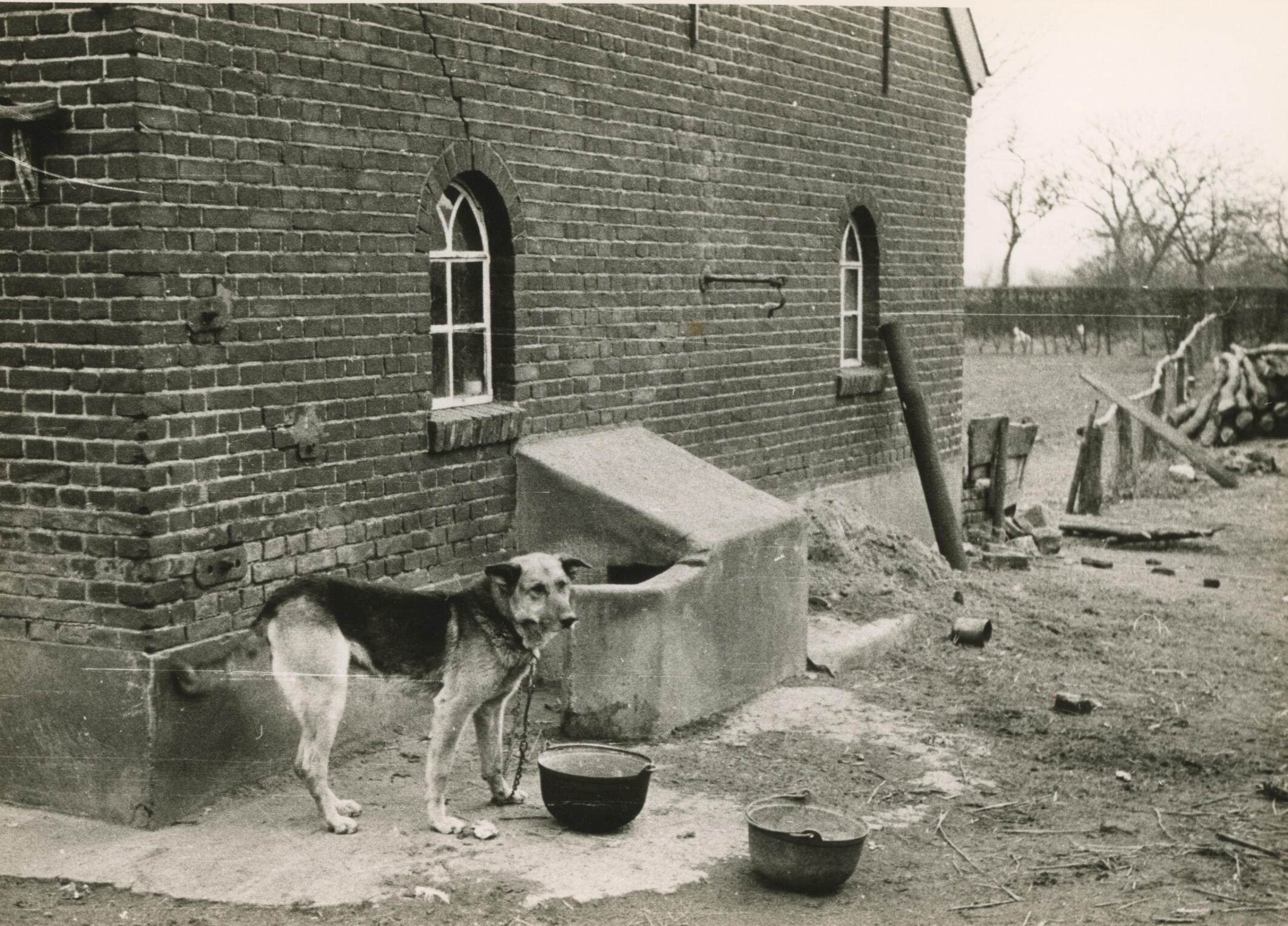 Hond bij een hondenhok, Haps, 1934 (zwart-wit foto)