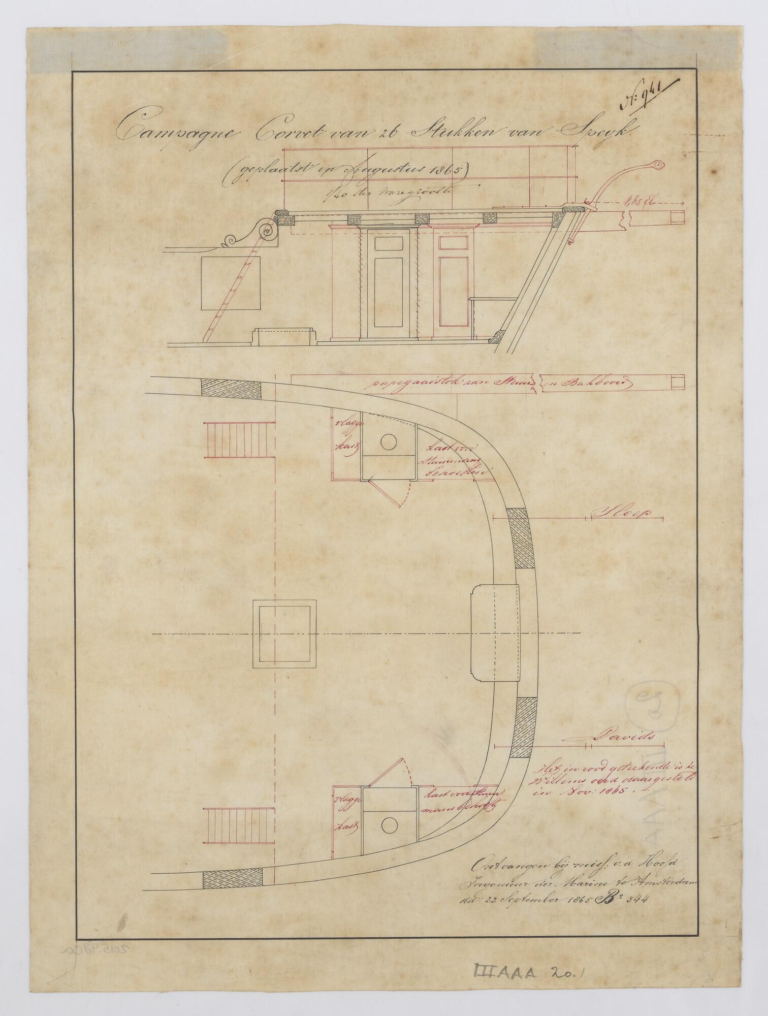 Indelingsplan van kajuit en hutten van de brik Zr.Ms...