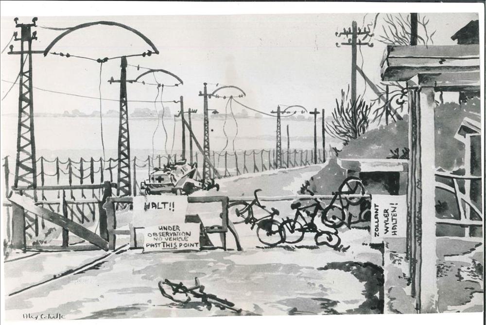 Zwart wit foto van Schilderij wegversperring met fie...