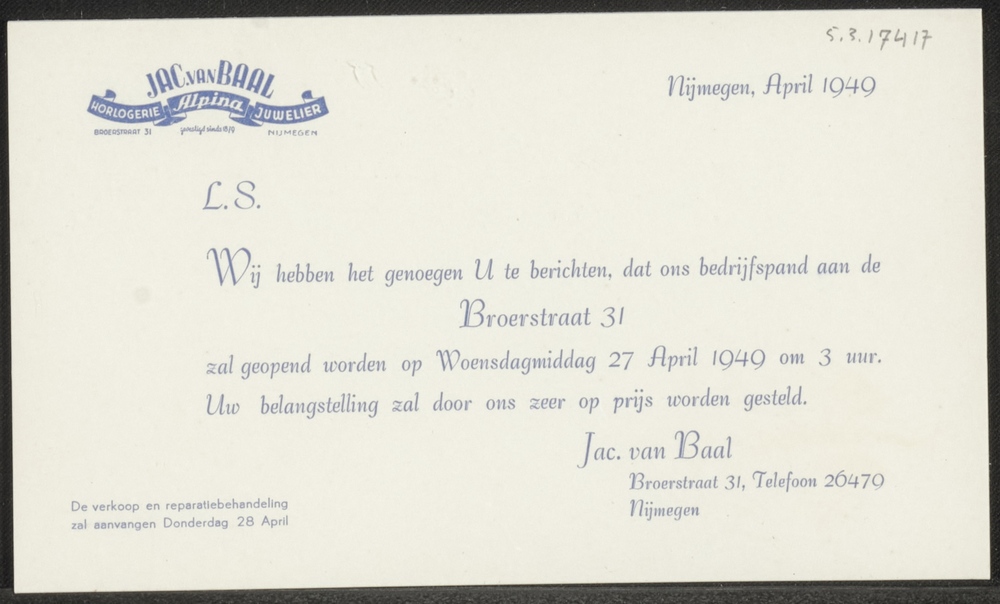 Kaart met uitnodiging om de opening van juwelier Jac...