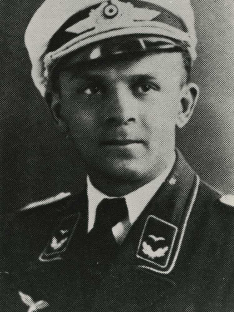 Foto van man in Luftwaffe uniform (Leutnant). Tekst ...