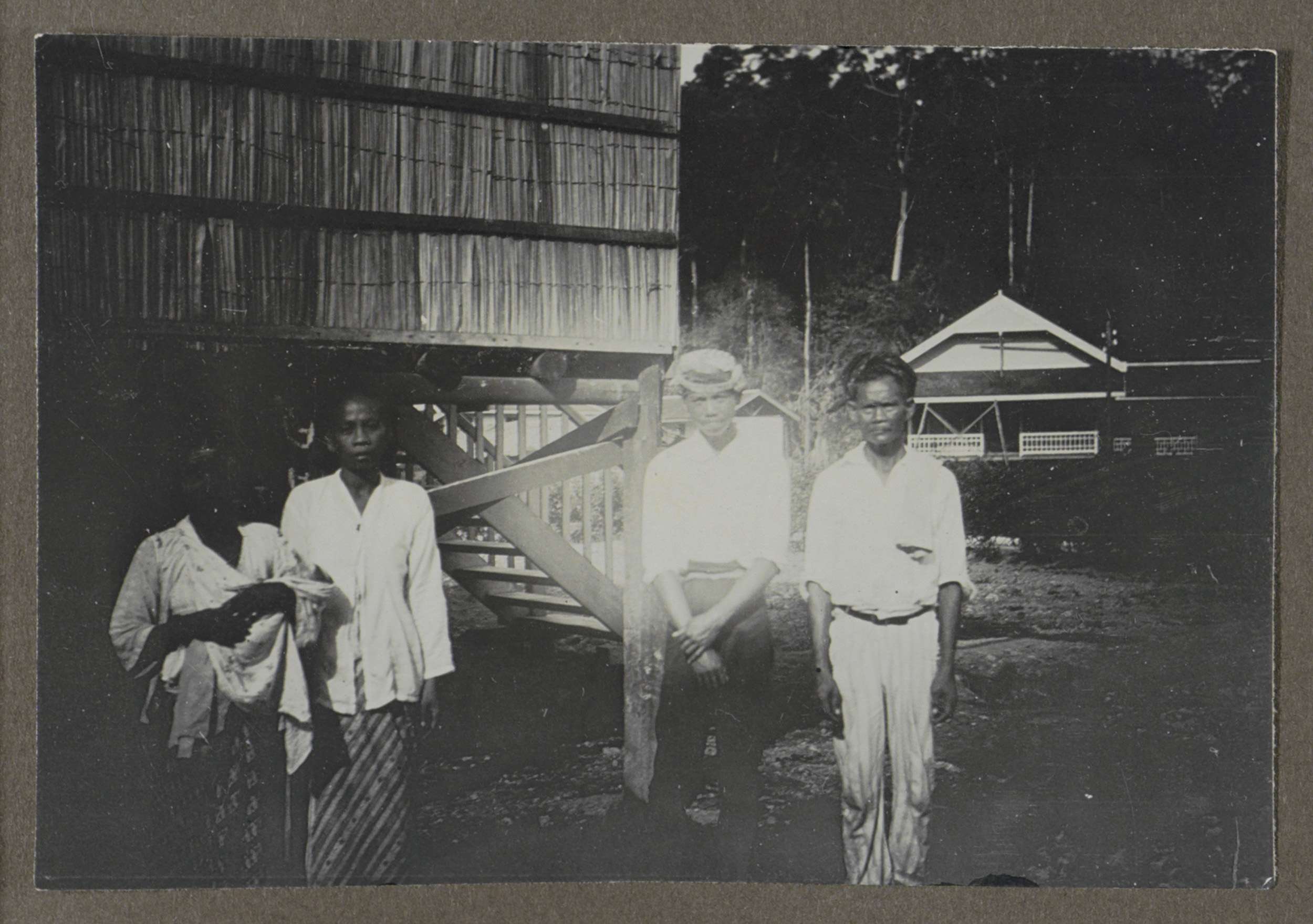 Vier Indische mannen en vrouwen staand voor een hout...