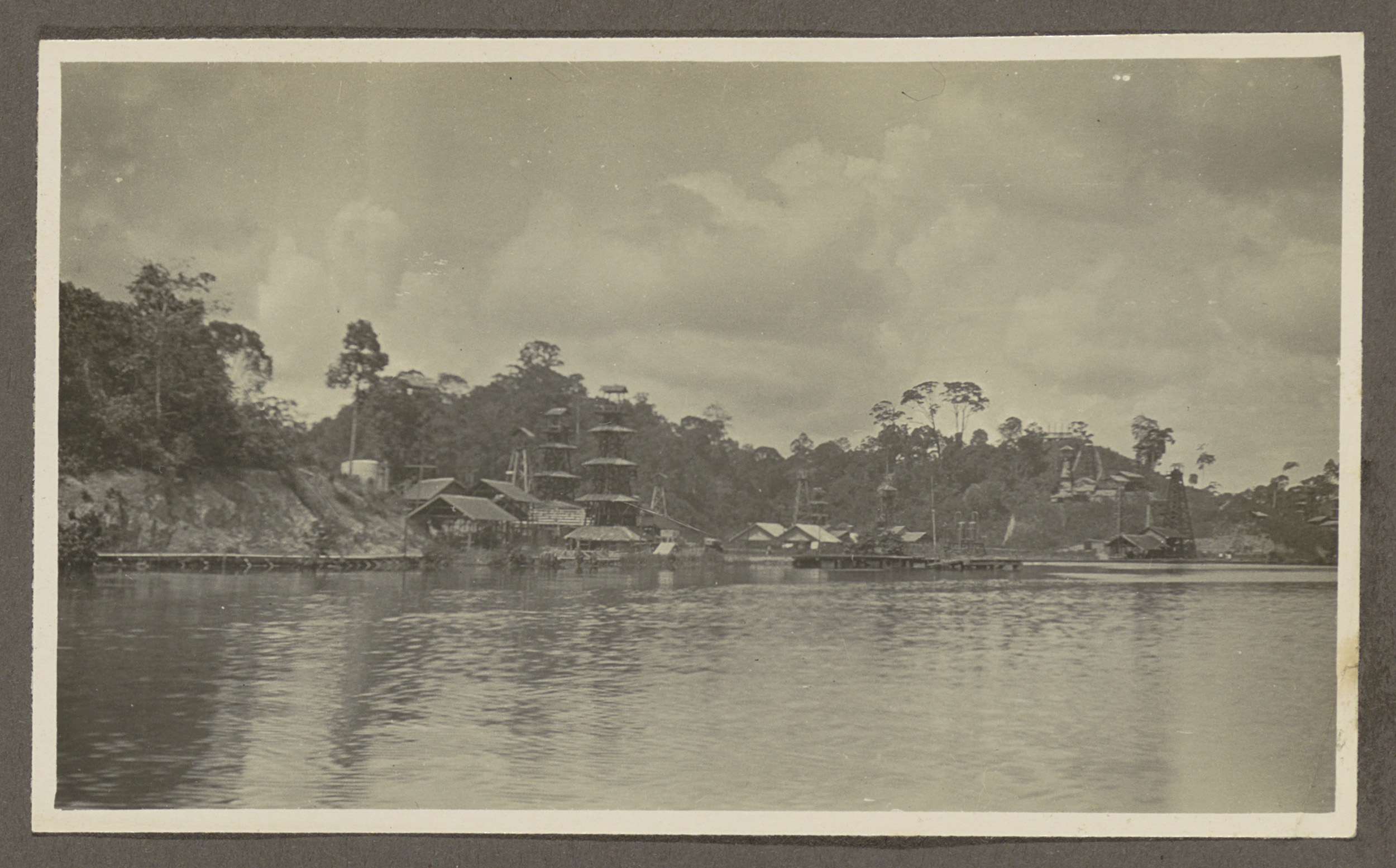Oever van een dorp met boortorens en gebouwen, gezie...