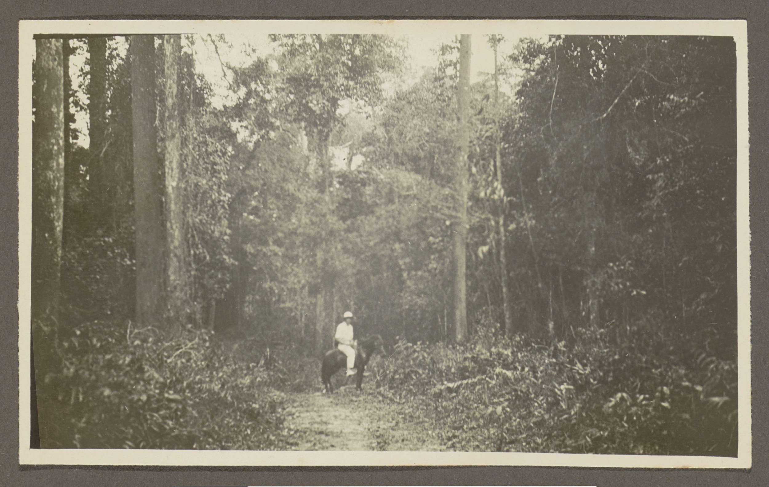 Man in tropenkleding te paard op een bospad