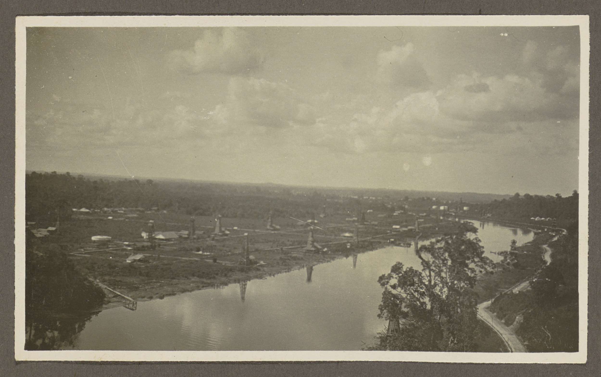 Panorama van een rivier, boortorens, opslagtanks en ...