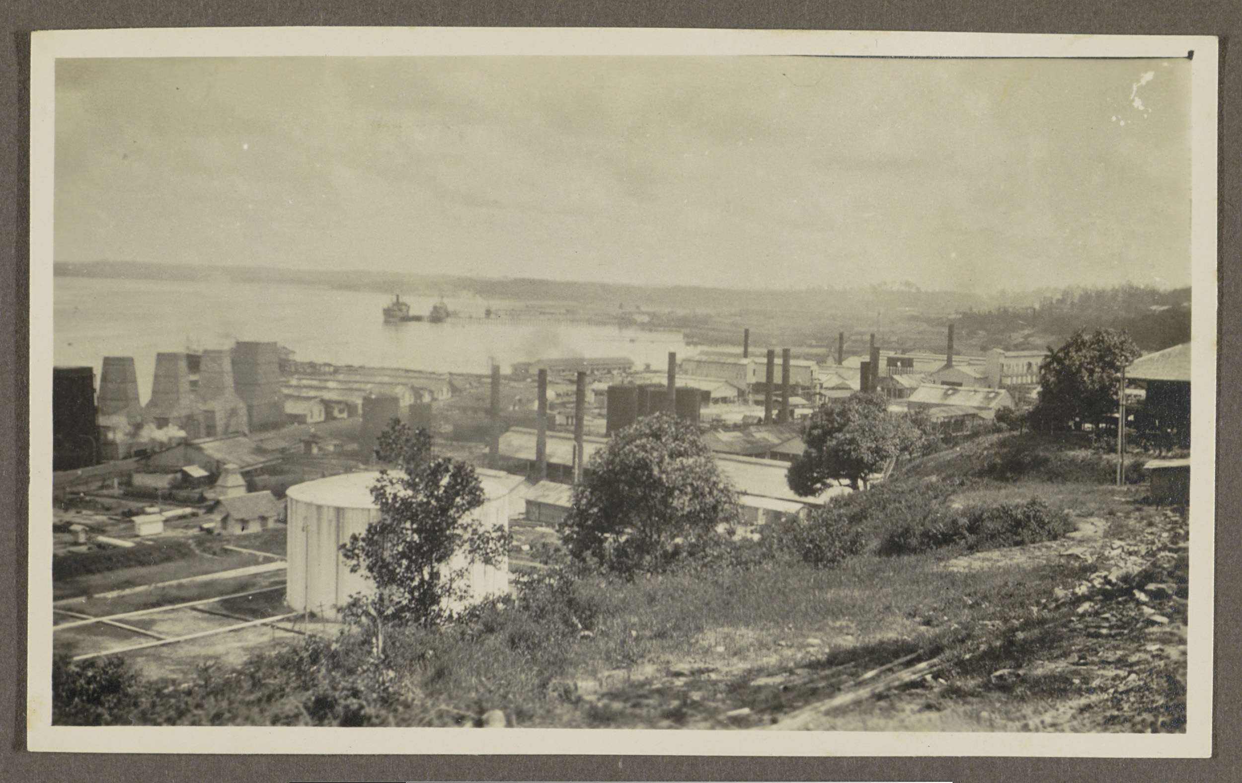 Haven met schepen, schoorstenen en opslagtanks