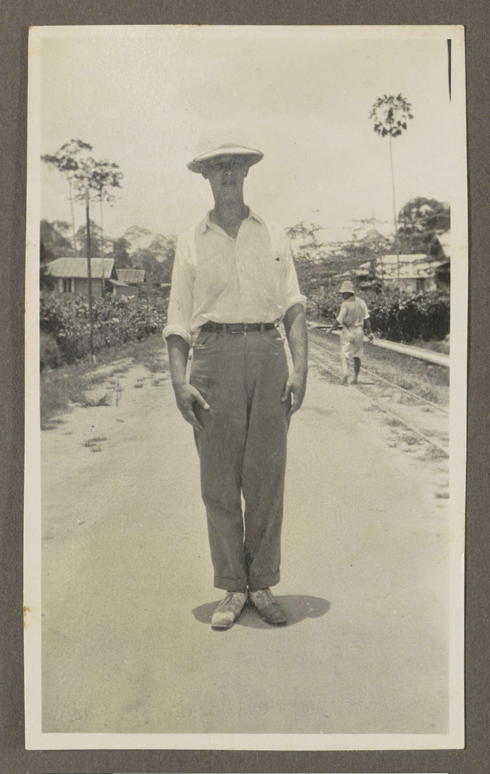 Man met een tropenhelm poserend op een weg