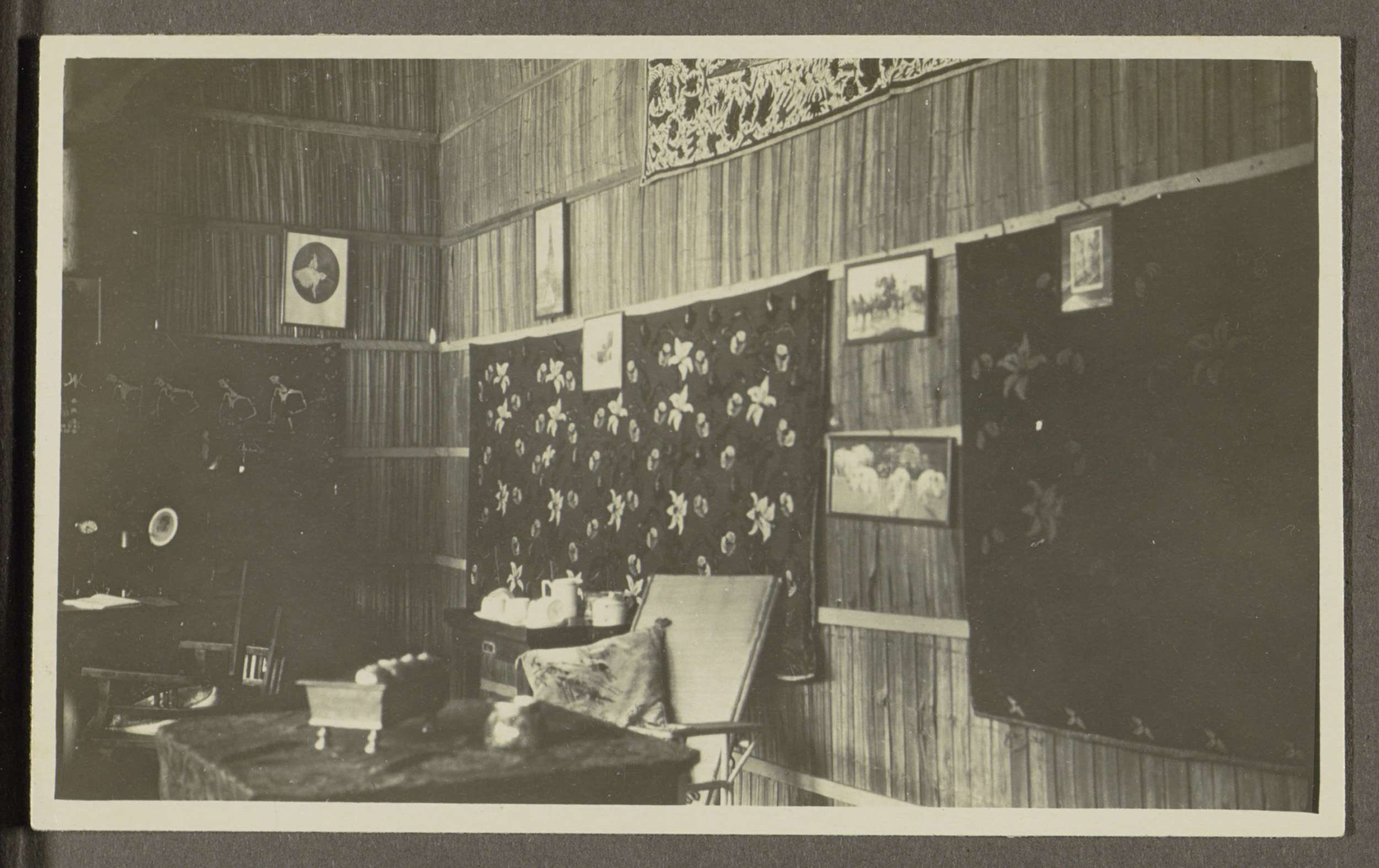 Hoek van een kamer met gebatikte kleden en ingelijst...