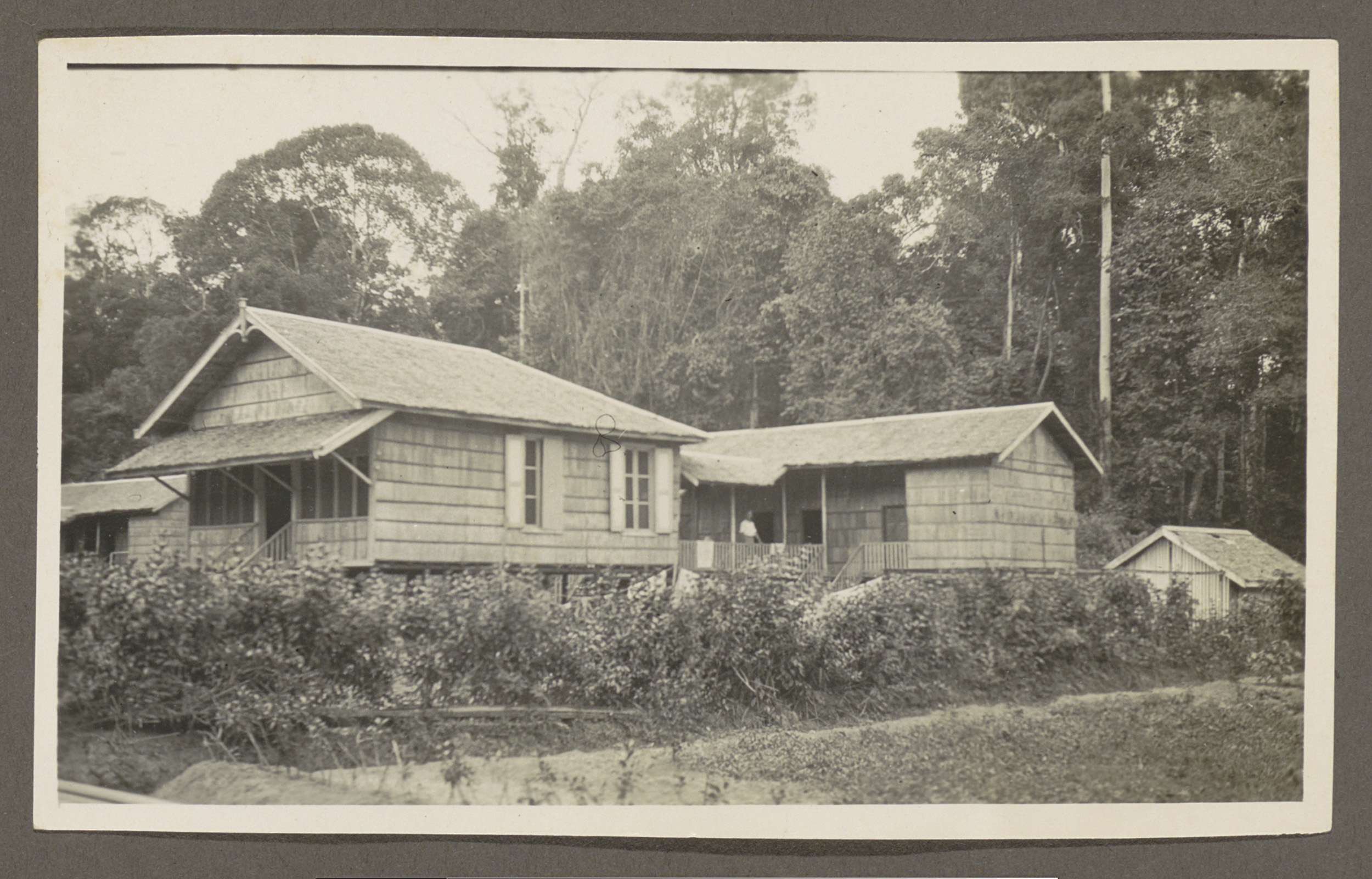 Twee houten huizen met veranda's en een bijgebouw