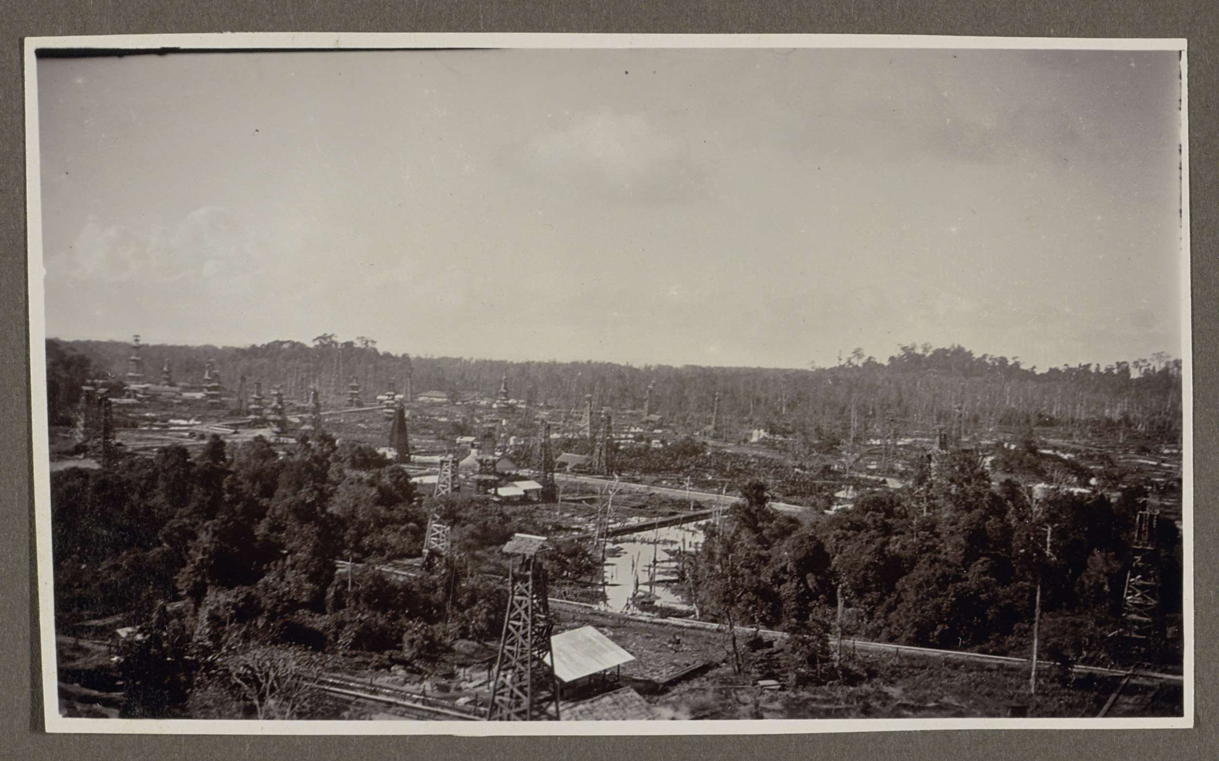 Overzicht van boortorens en gebouwen temidden van bomen