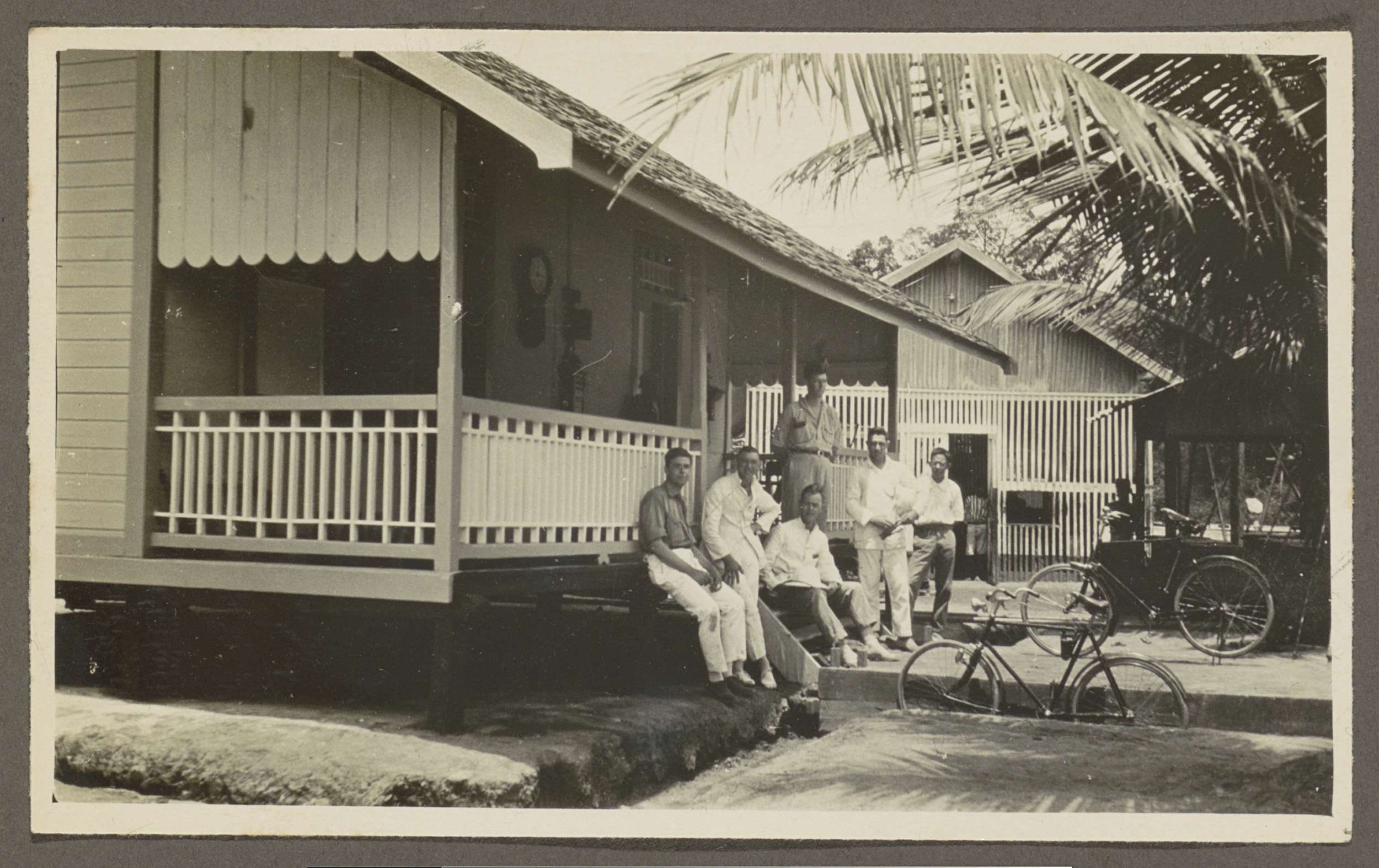 Groep mannen poserend voor een houten huis