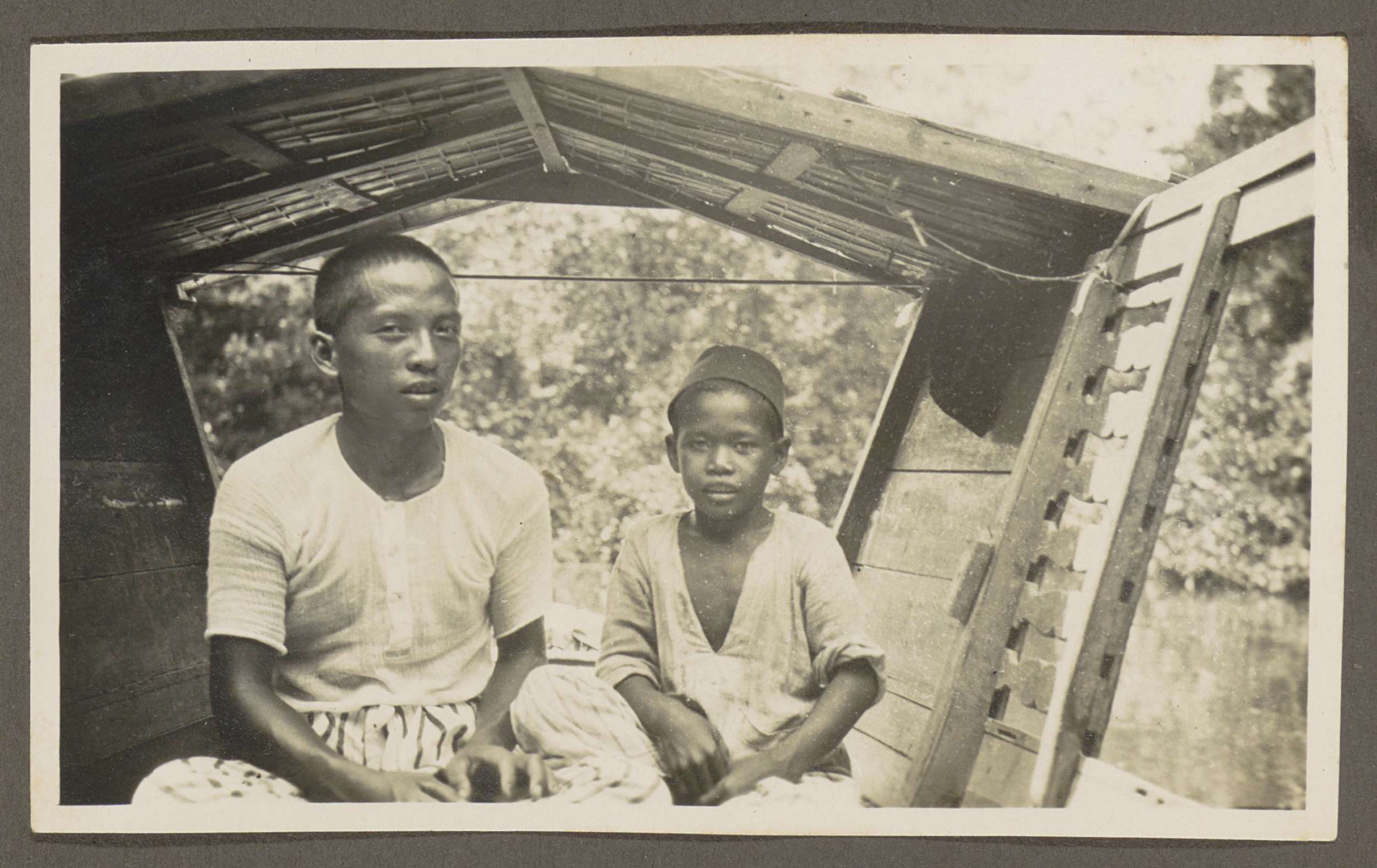 Twee jongens zittend in overkapte houten boot