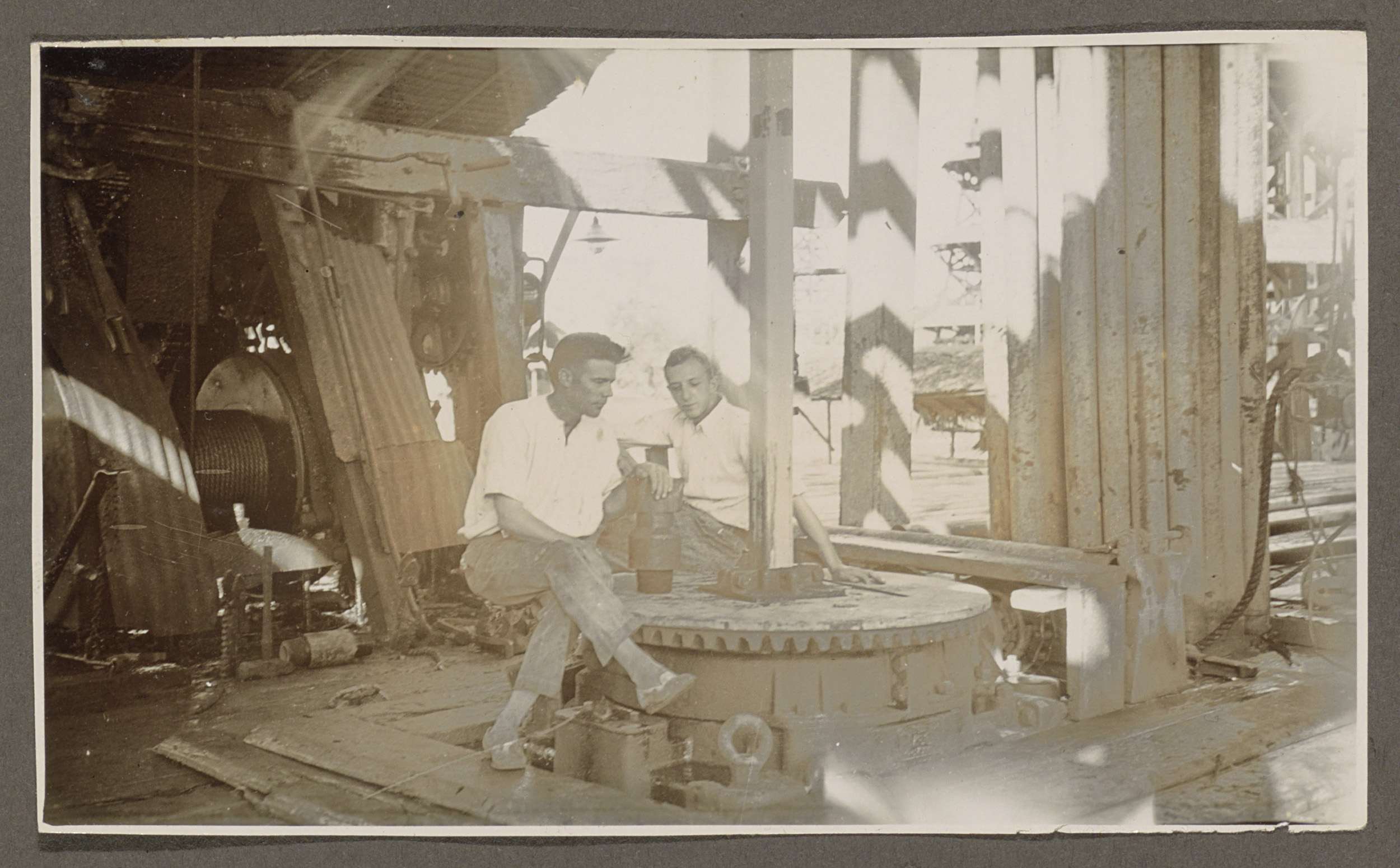 Twee mannen zittend in een boortoren