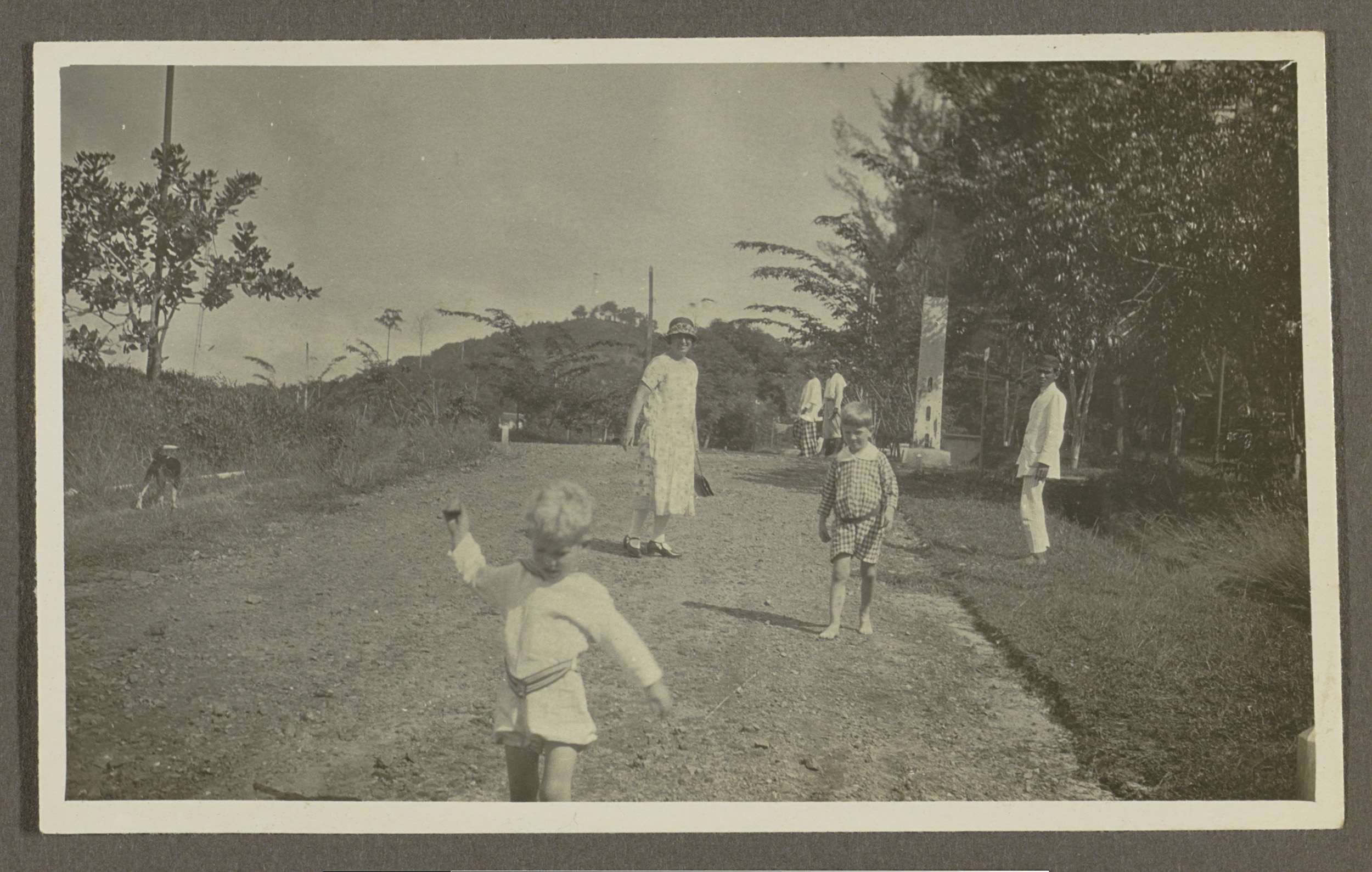 Vrouw met kinderen en Indiërs op een laan