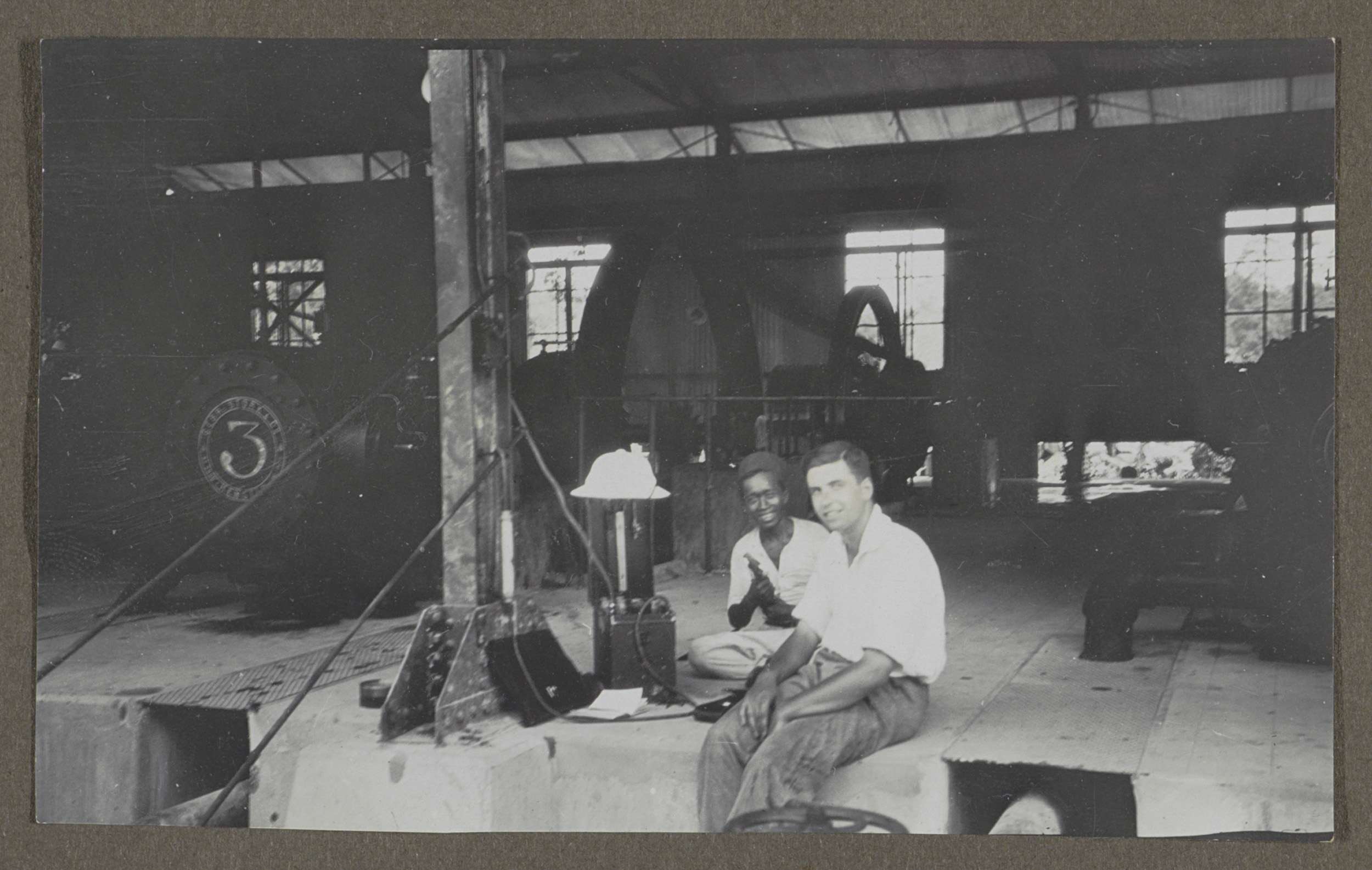 Twee mannen zittend op de vloer van een machinekamer