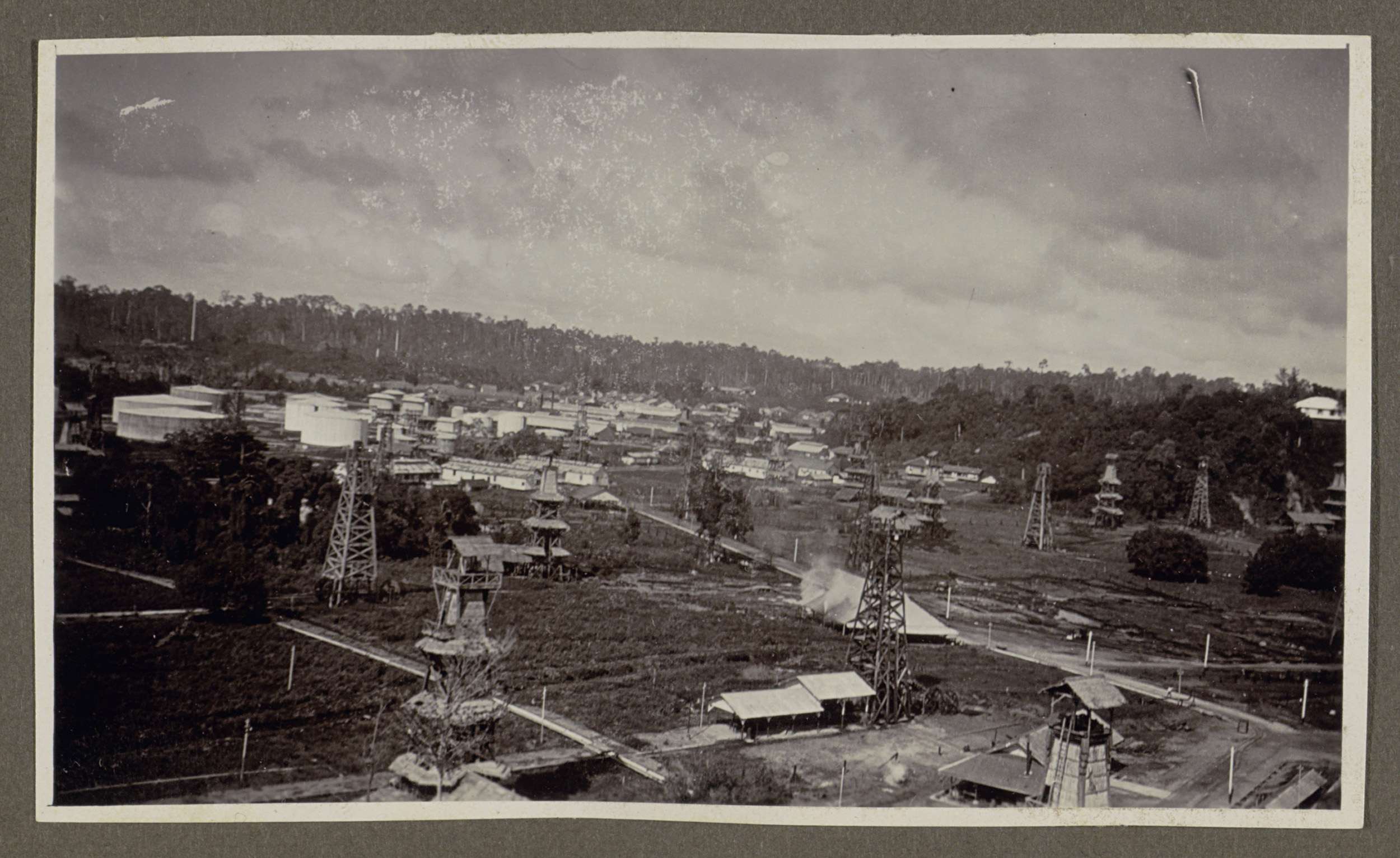 Overzicht van boortorens, opslagtanks en gebouwen te...