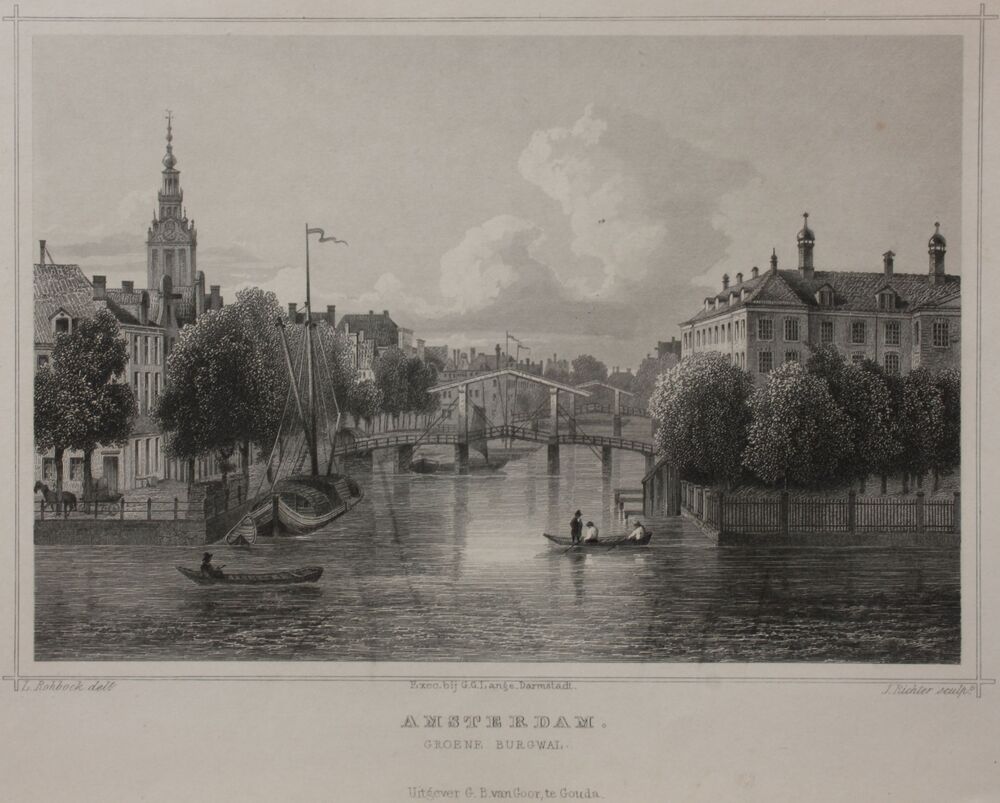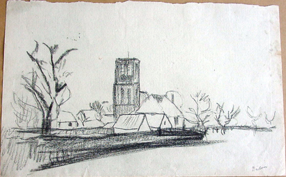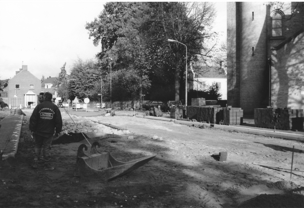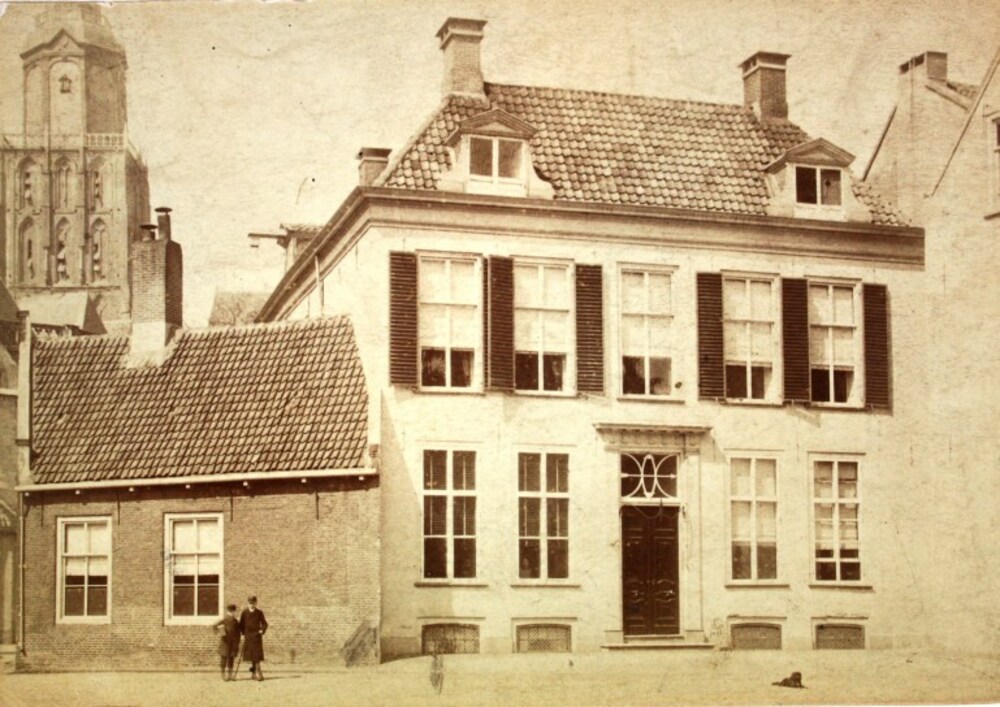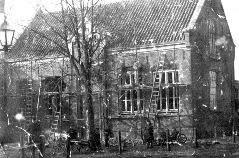 Zwart-wit foto van het oude schoolgebouw uit 1869 in...