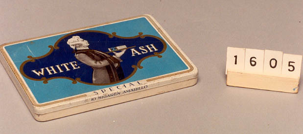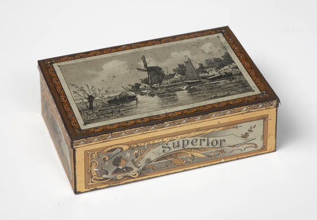 Gele doos met zwarte opdruk voor Stoomtabakskerverij...