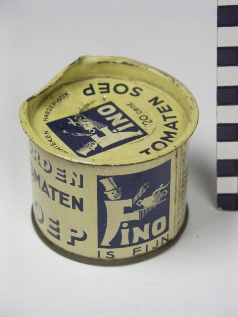 Ronde gele bus met blauwe opdruk voor tomatensoep va...