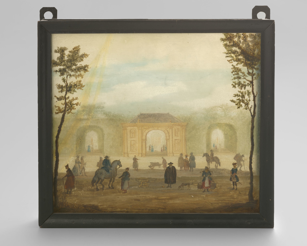 Achterglasschildering met gezicht op een stadspoort