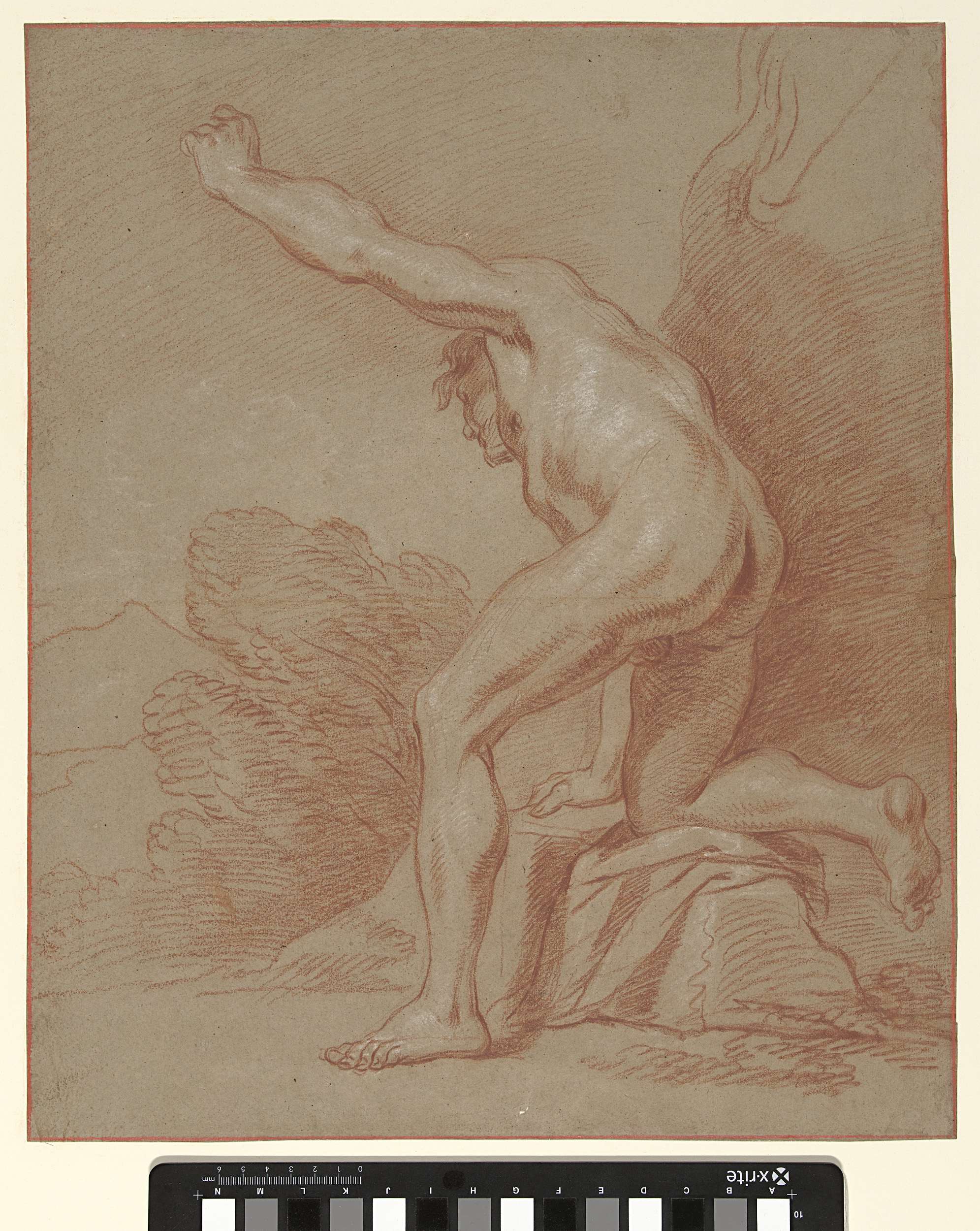 Mannelijk naakt knielend op één knie, de linkerarm g...