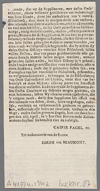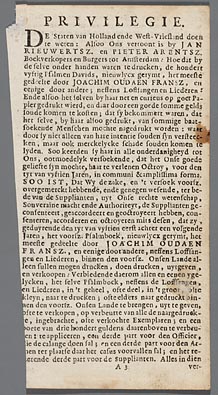 Blad met titelpagina, 13 kolommen tekst en een opdra...