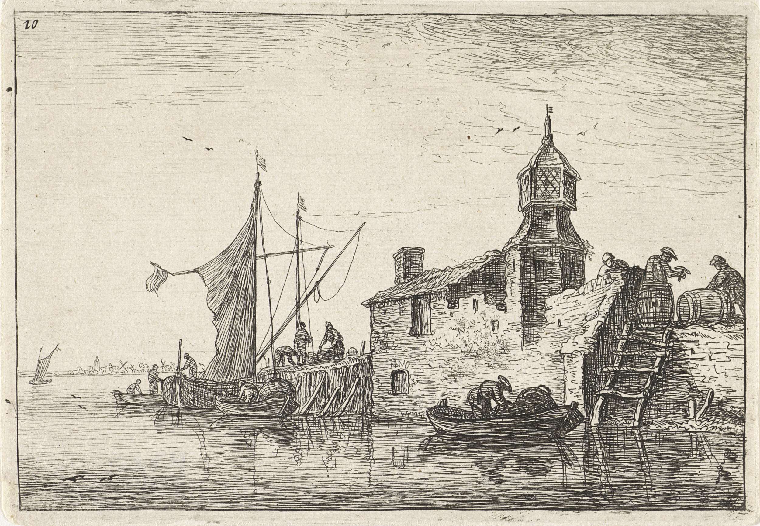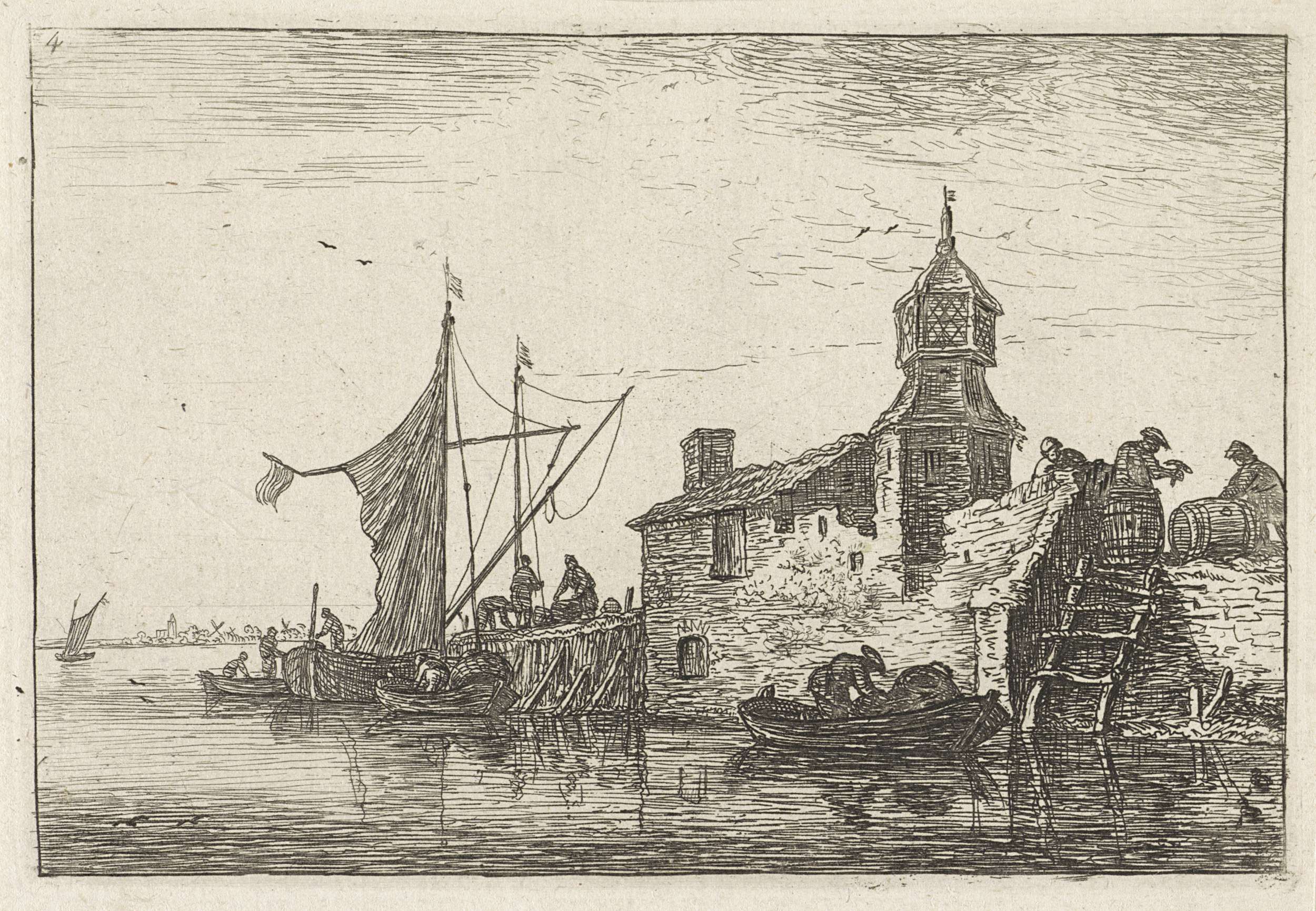 Aanlegplaats bij een gebouw met een toren