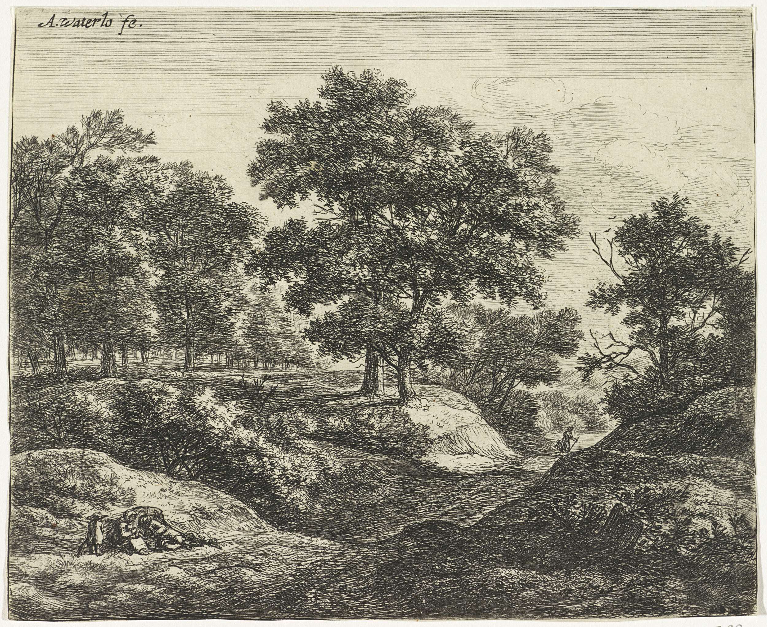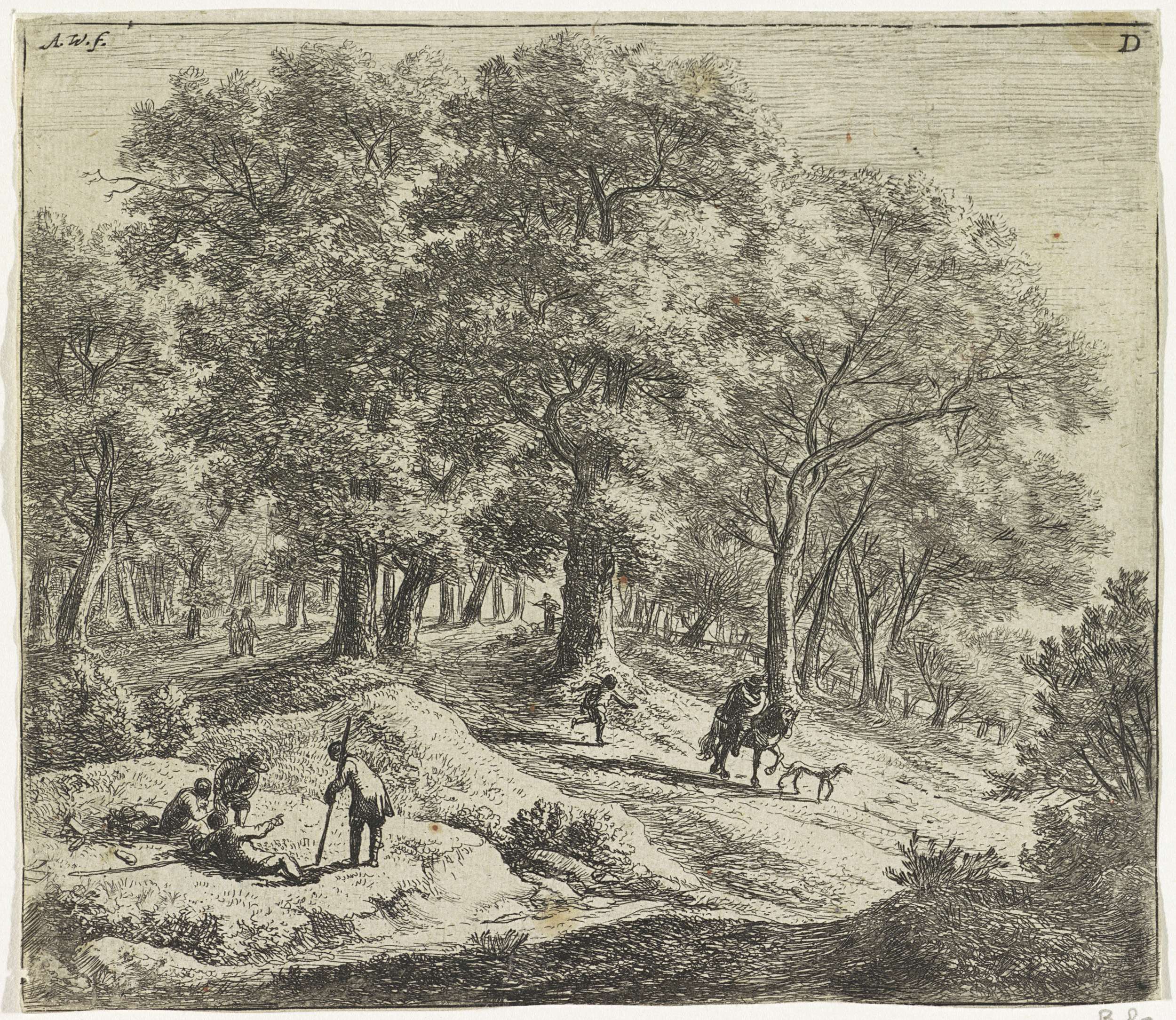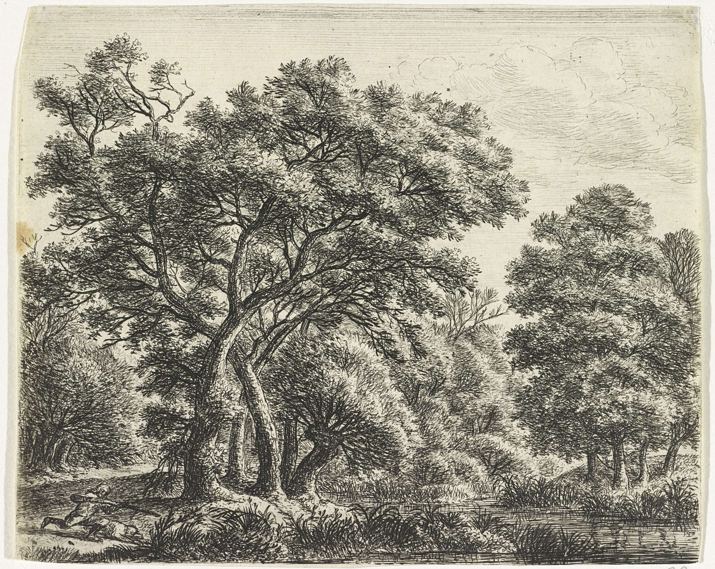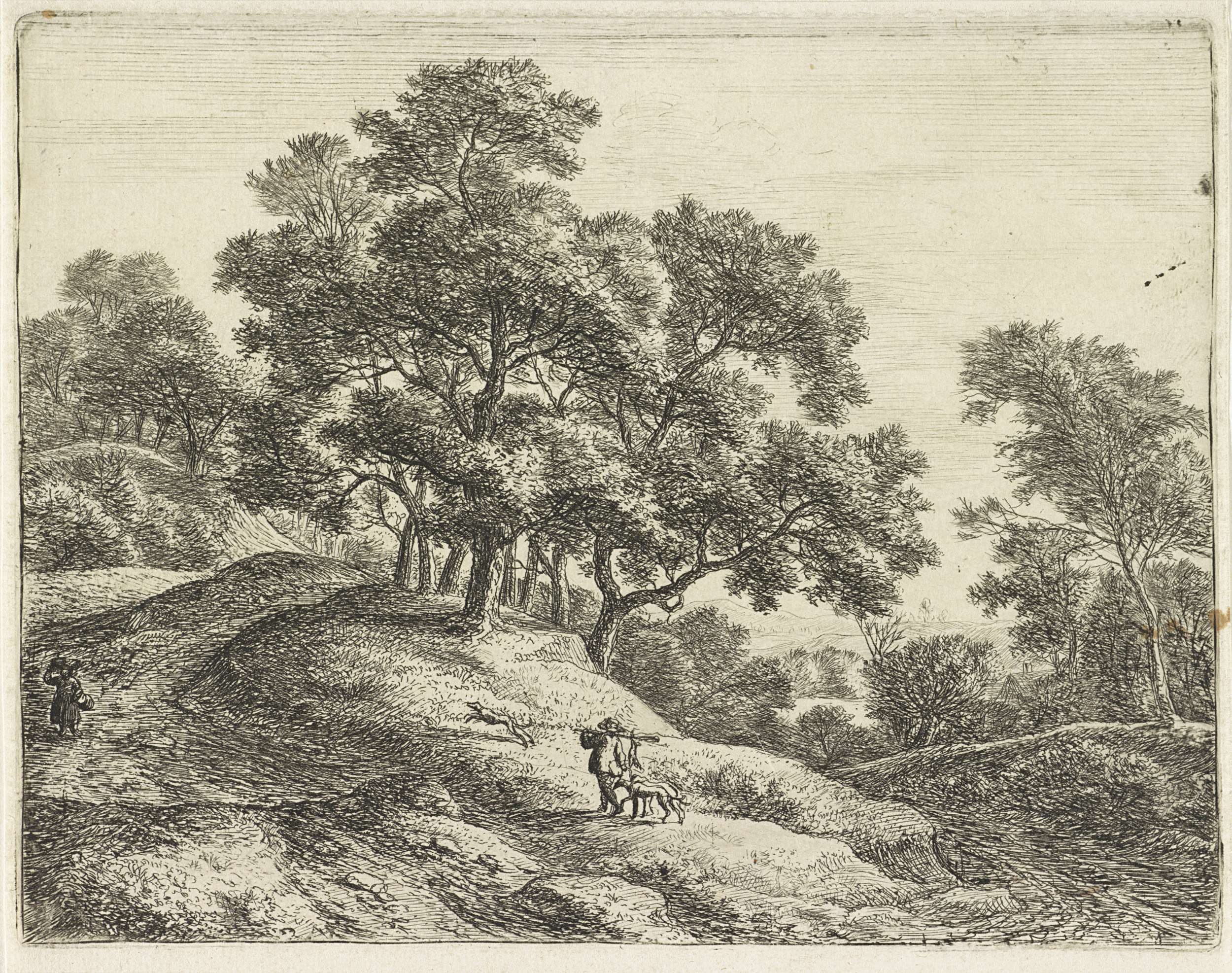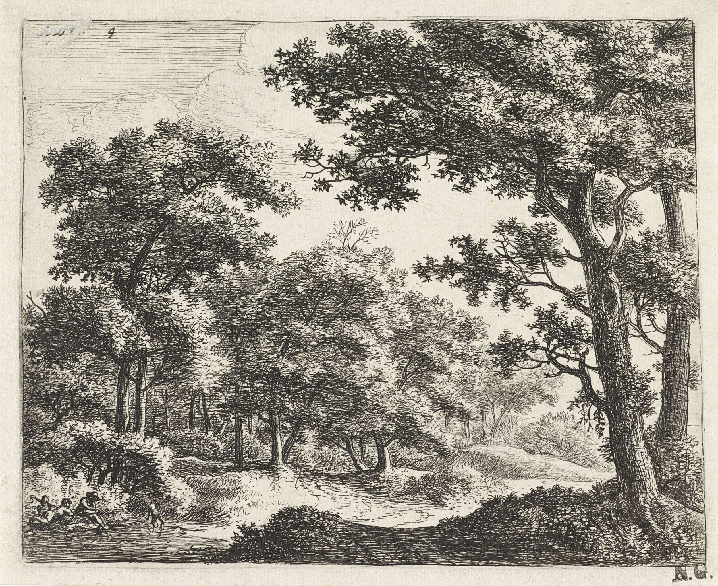 Bosgezicht met rustende wandelaars en een jager