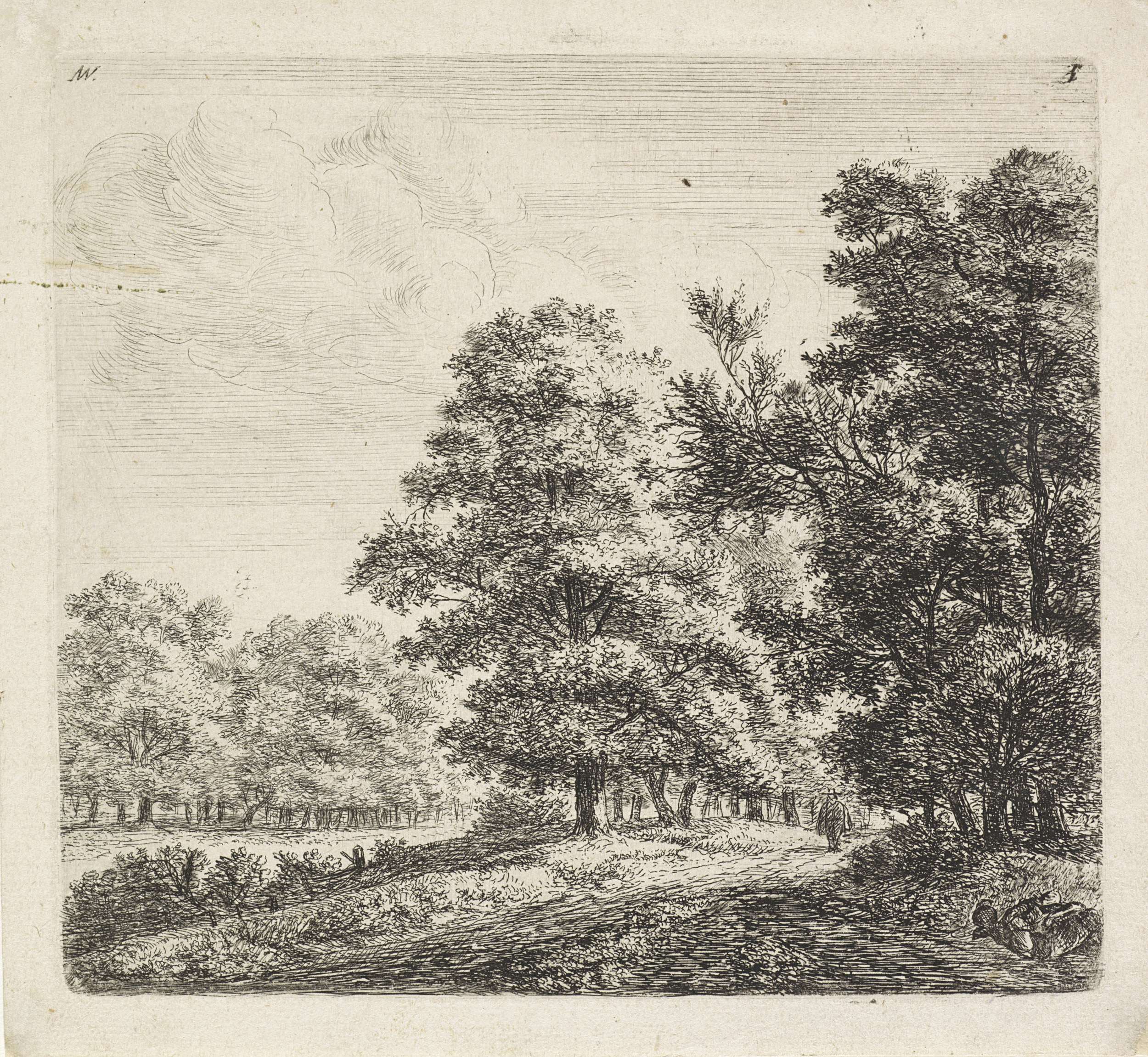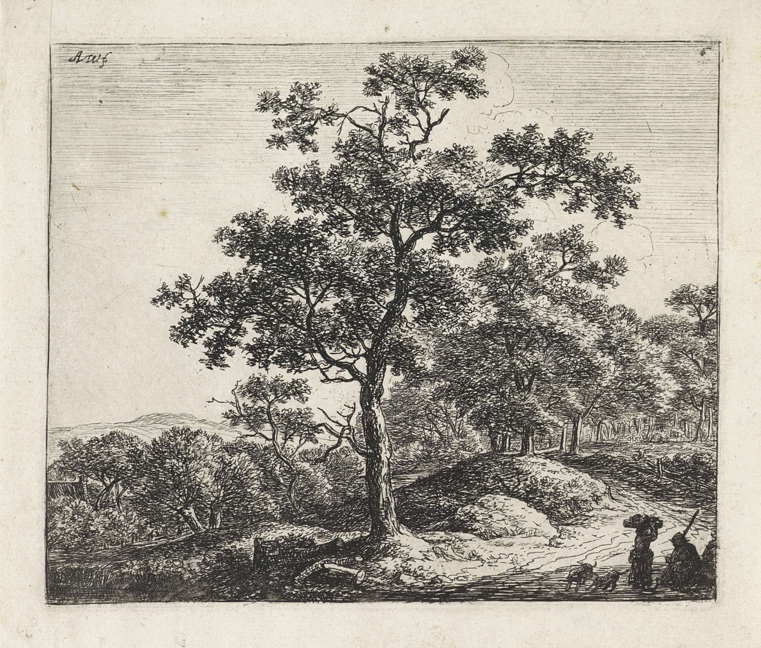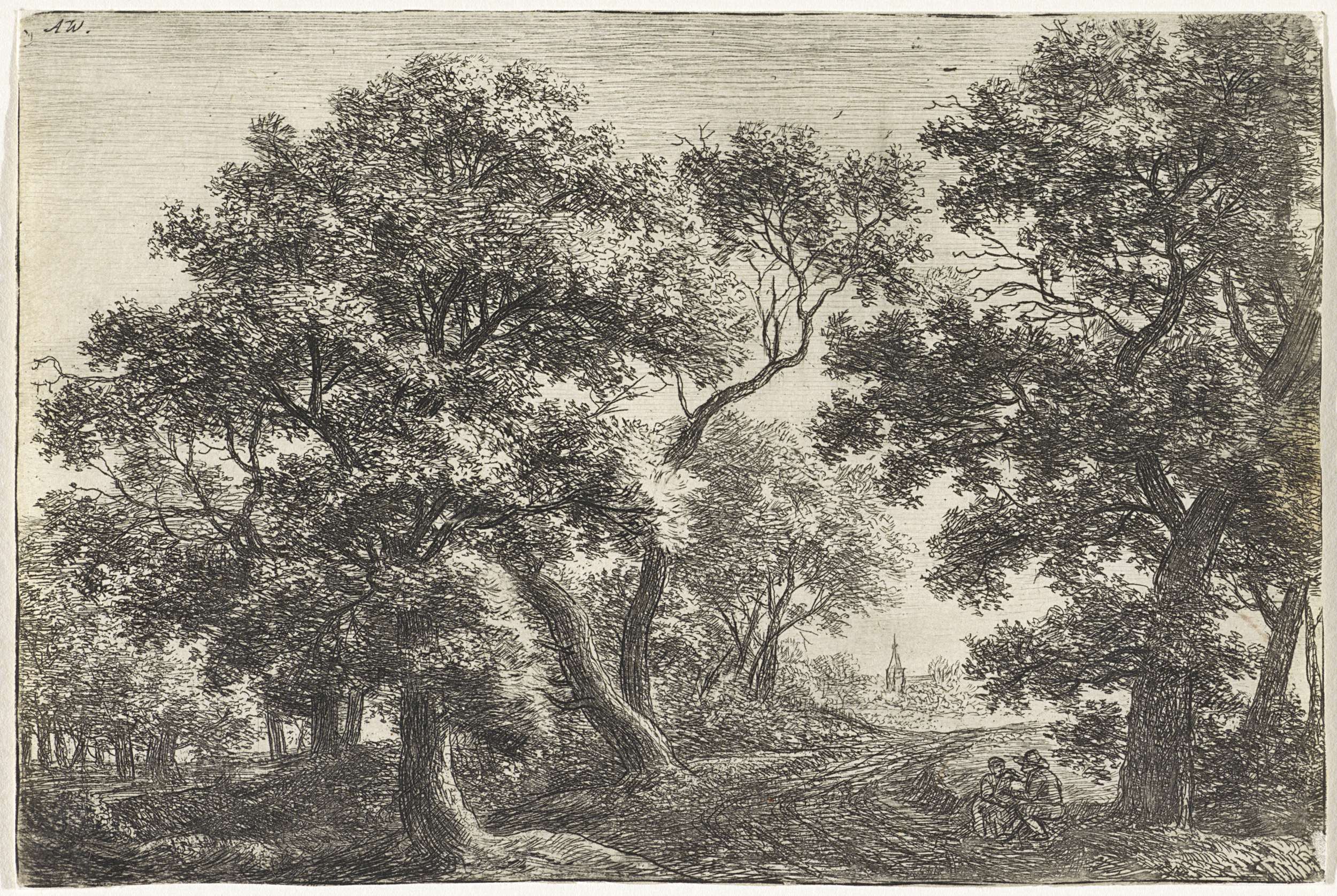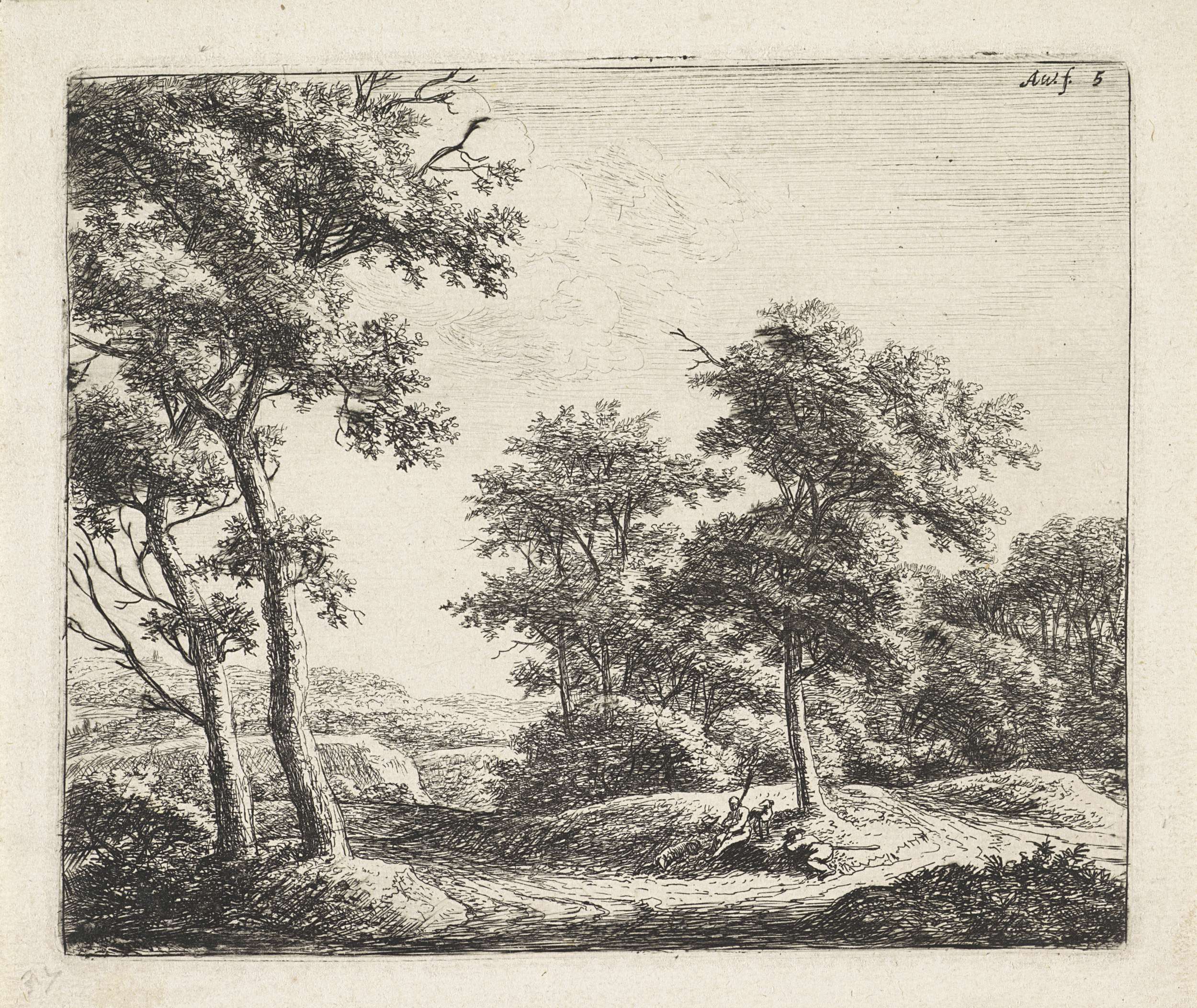 Bosgezicht met rustende wandelaars en een jager