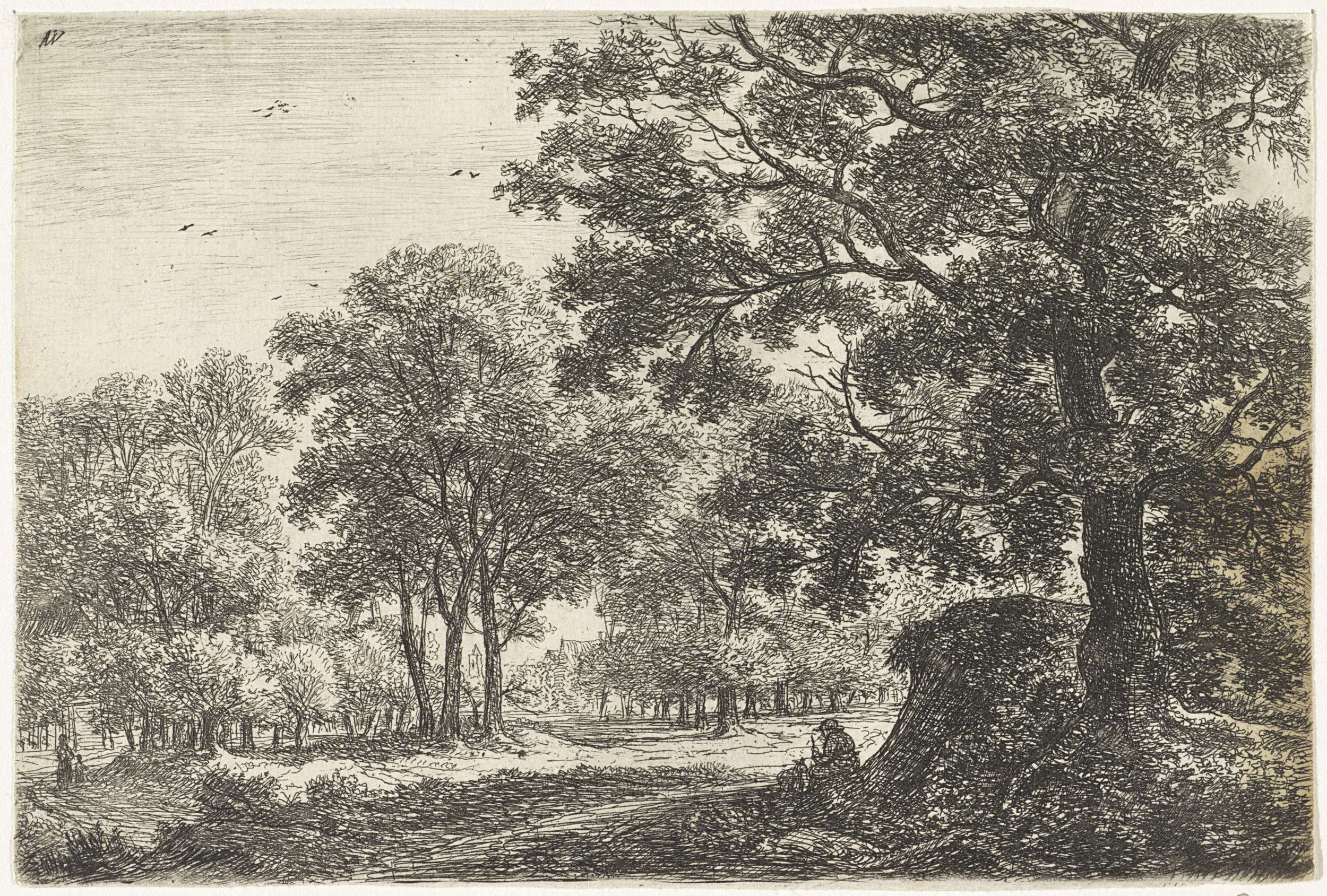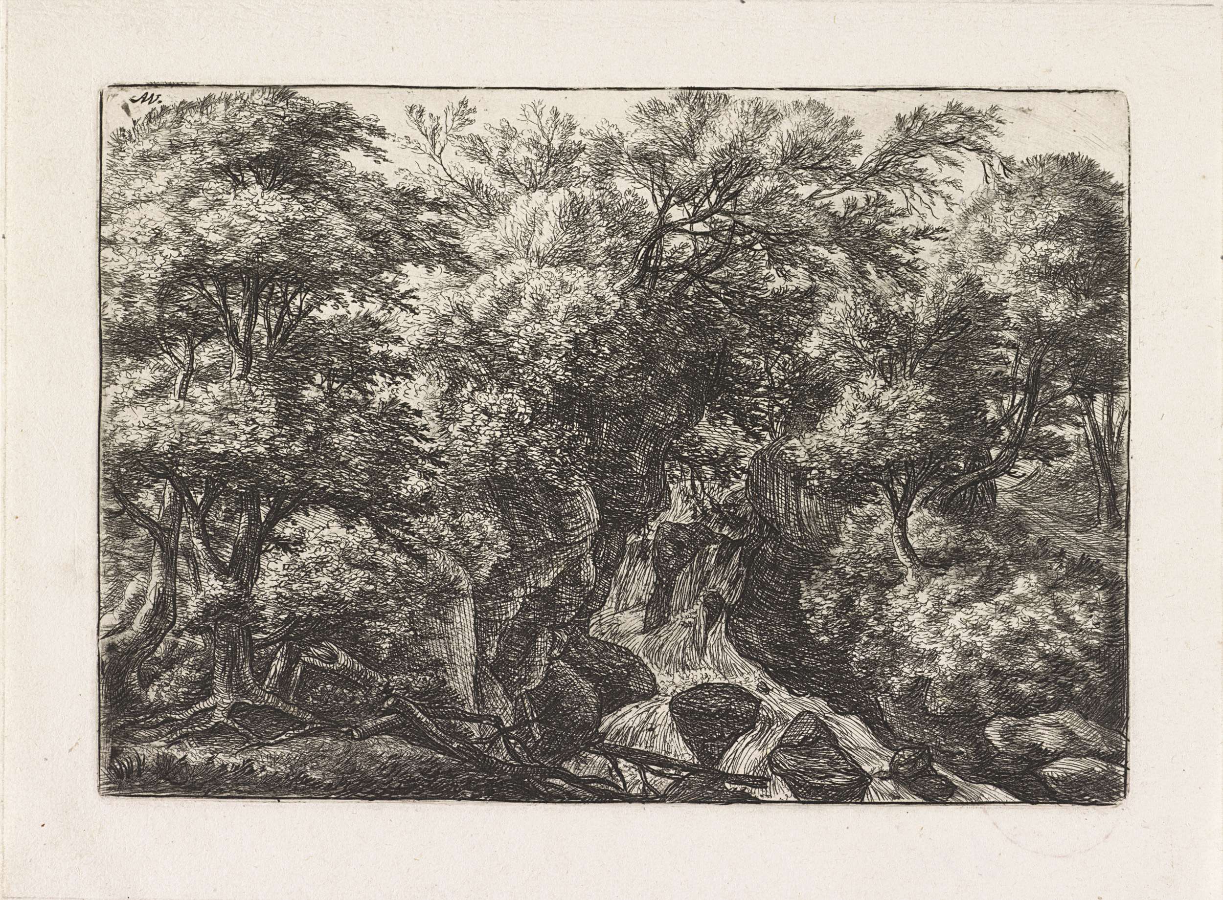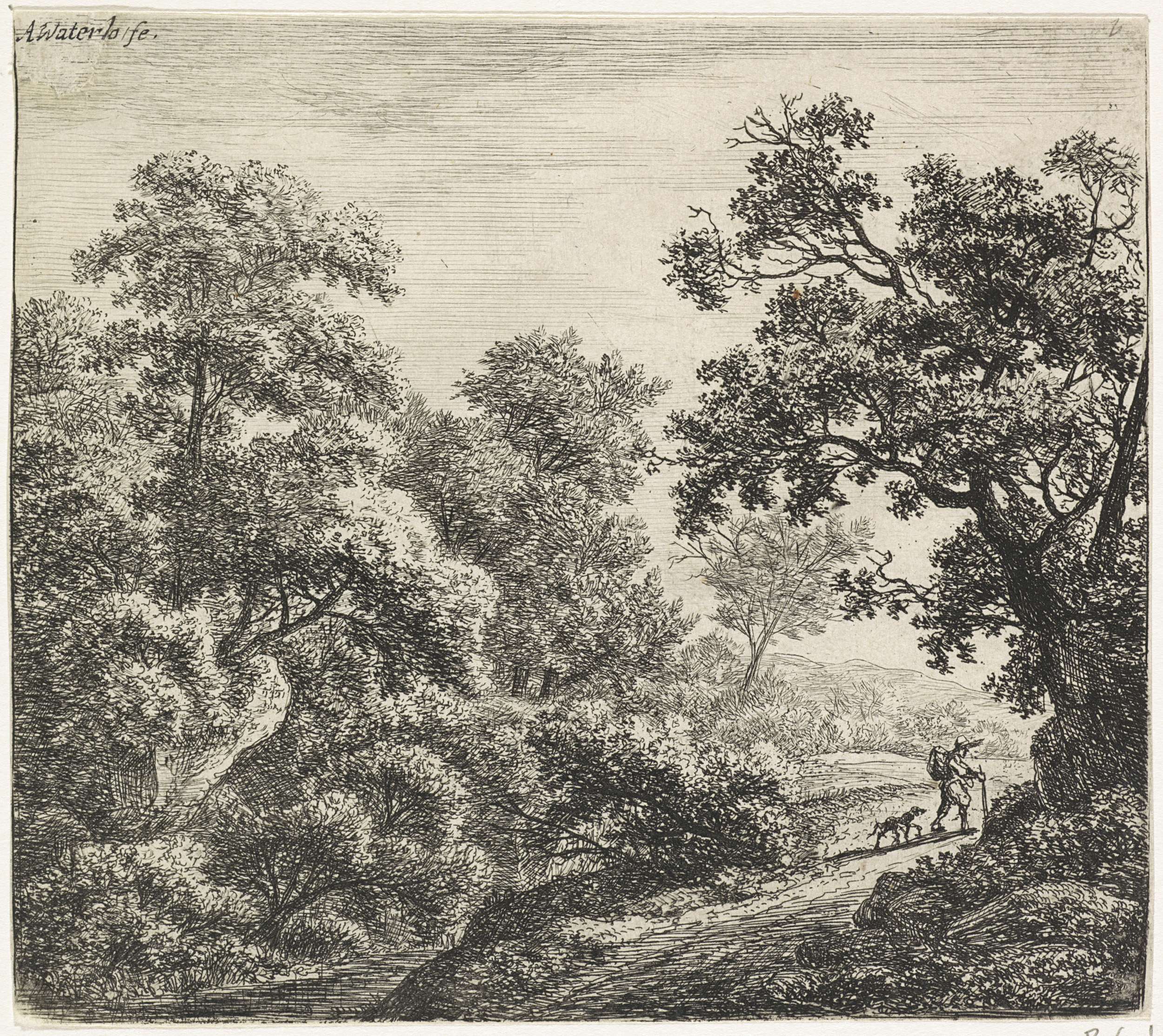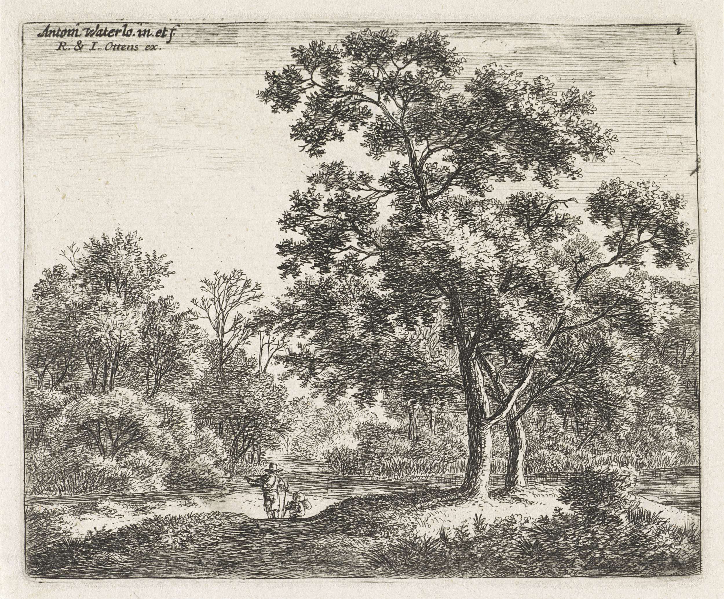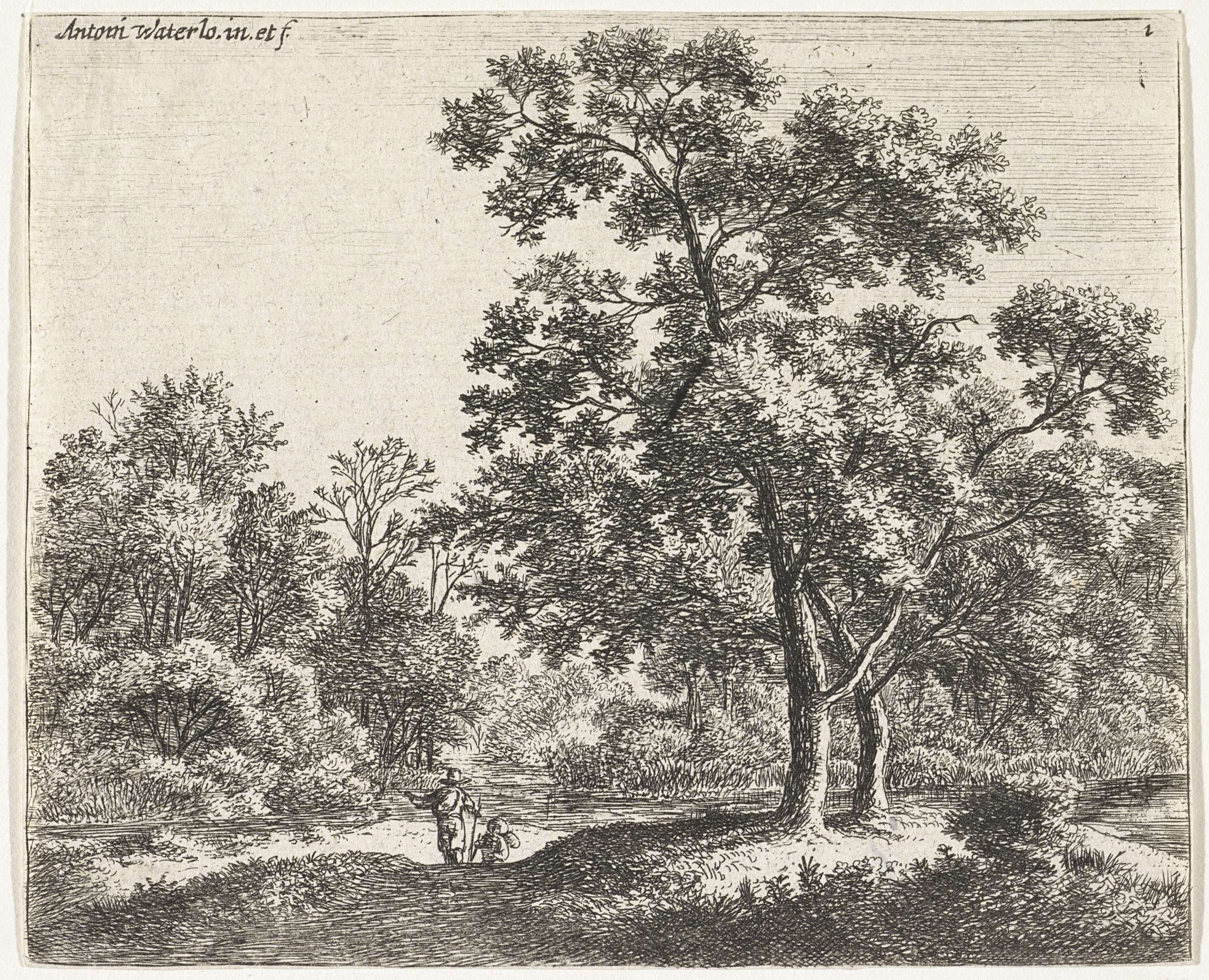 Bosgezicht met rustende wandelaars en een jager