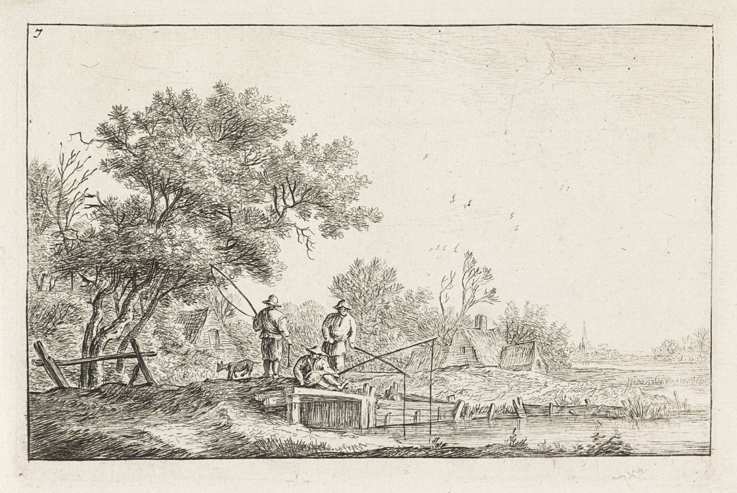 Drie vissers op een brug