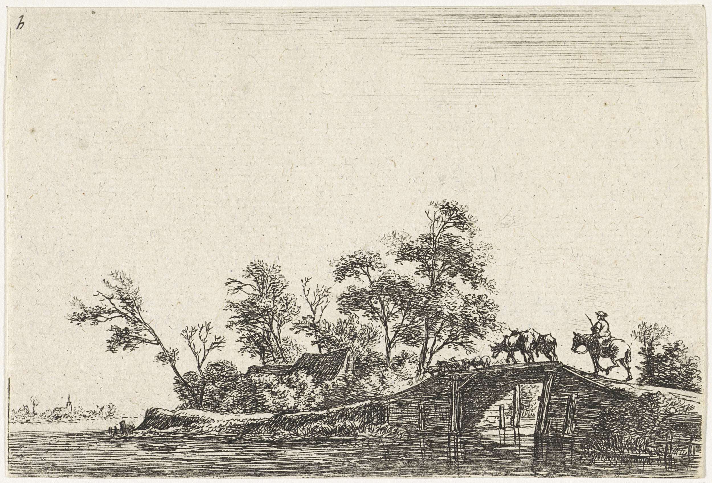 Herder met vee op een houten brug