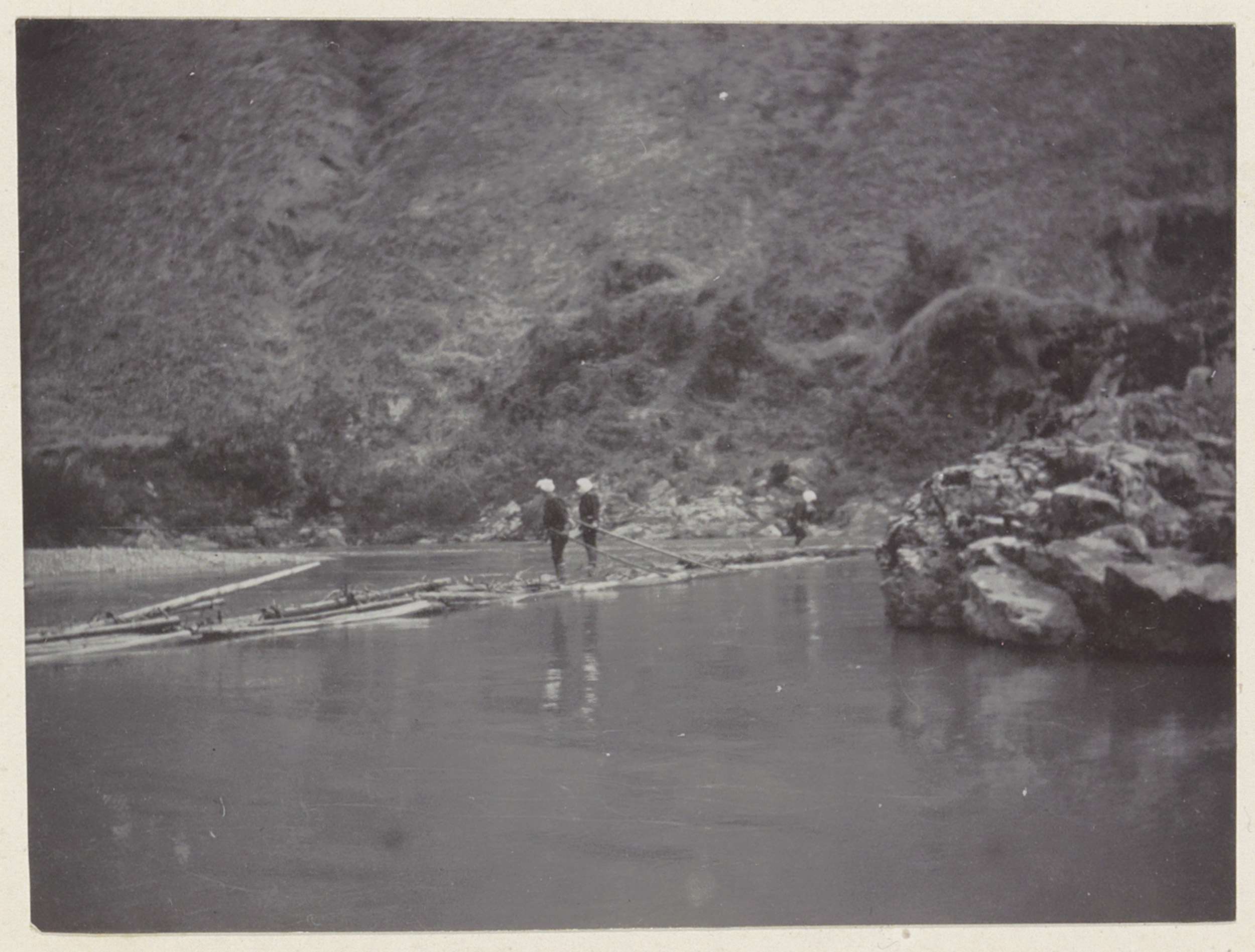 Mannen op een vlot in een rivier in Japan, mogelijk ...