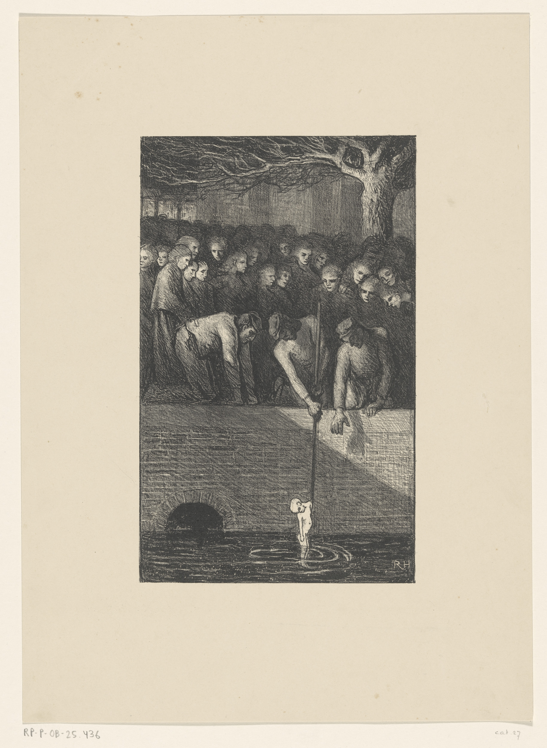 Man die een babylijk uit een gracht haalt