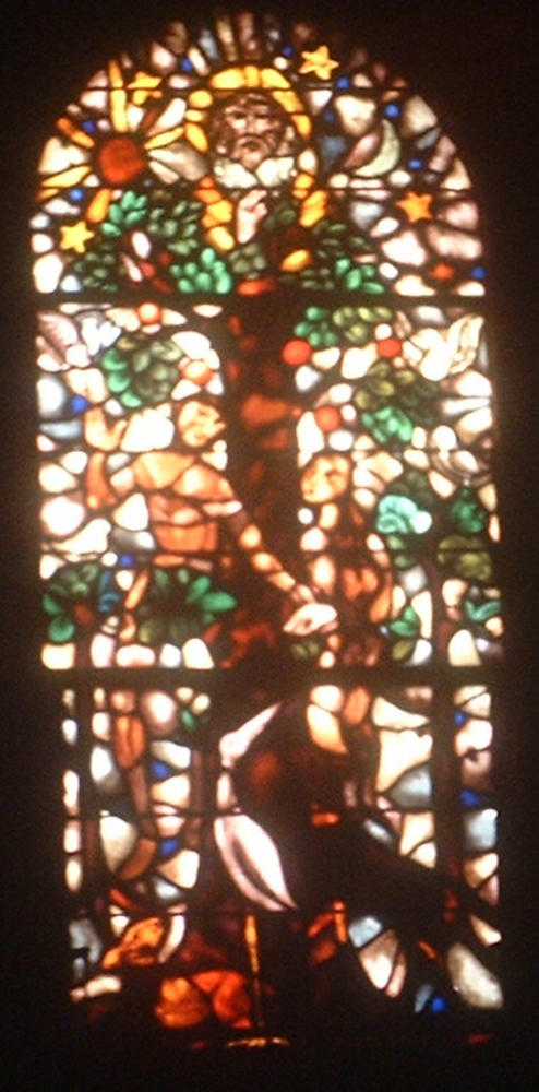 Glasraam van de stadskerk in Huissen Adam en Eva en ...