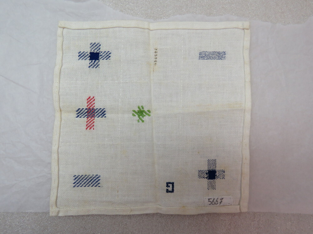 proeflap van wit linnen met gekleurd garen, ca. 1925