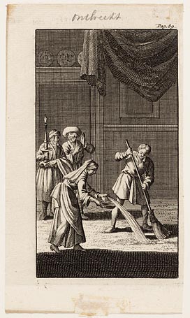 Christen ziet toe hoe een man stof opveegt waarop ee...