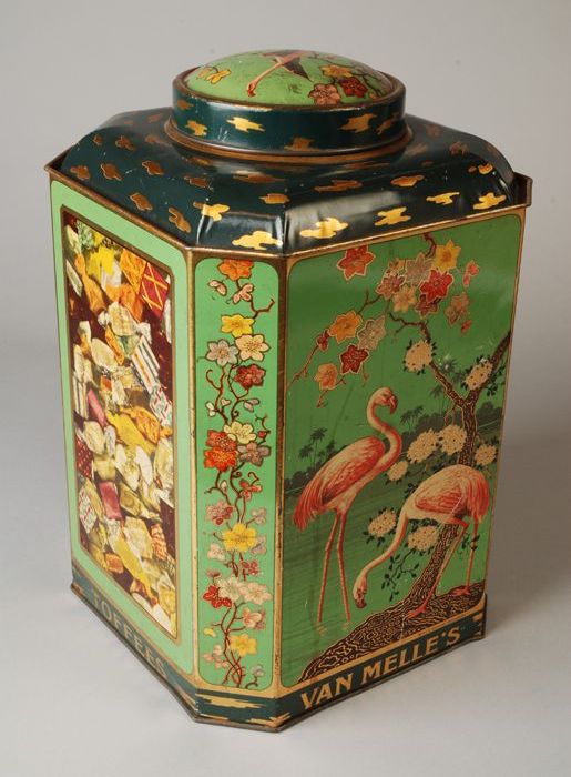 Gekleurd rechthoekig blik Van Melle Toffees met etik...