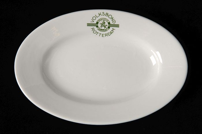 Witte ovale schaal met groen logo Volksbond Rotterdam
