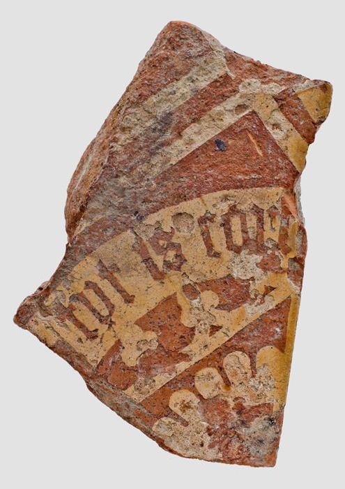 Aardewerk plavuis met tekst en versiering in slibtec...