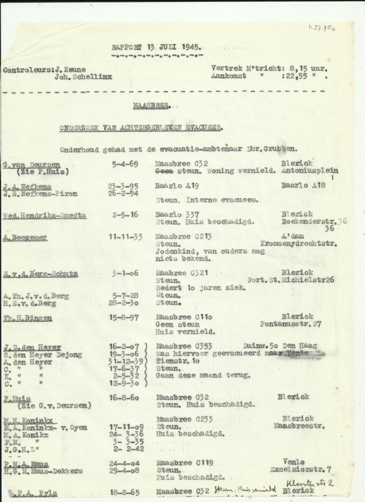 Rapport 13 juli 1945 bezoek Maasbree door J. Schellinx