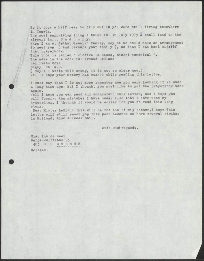 Afschrift van brief van I. de Beer aan Armand LeBlanc,
