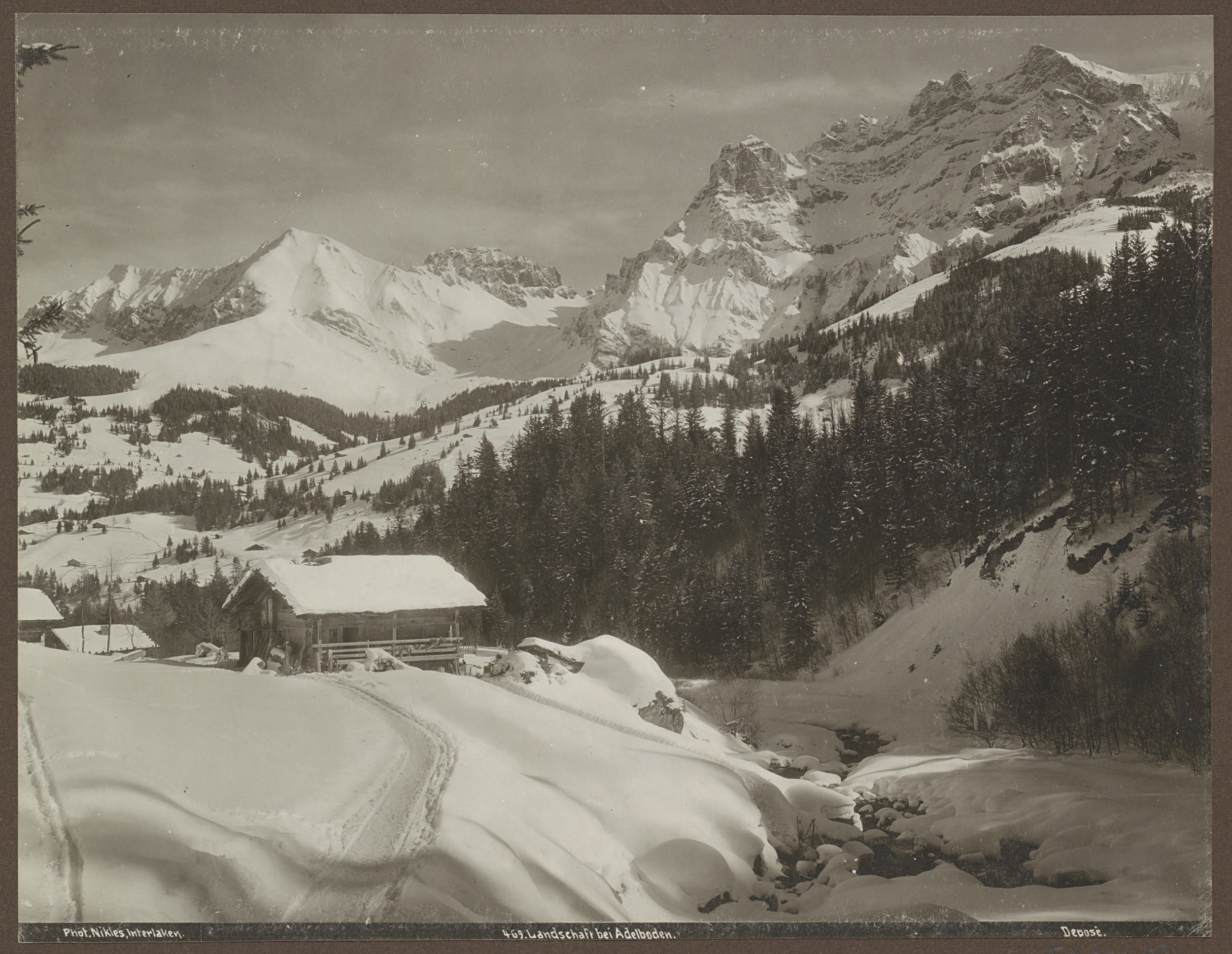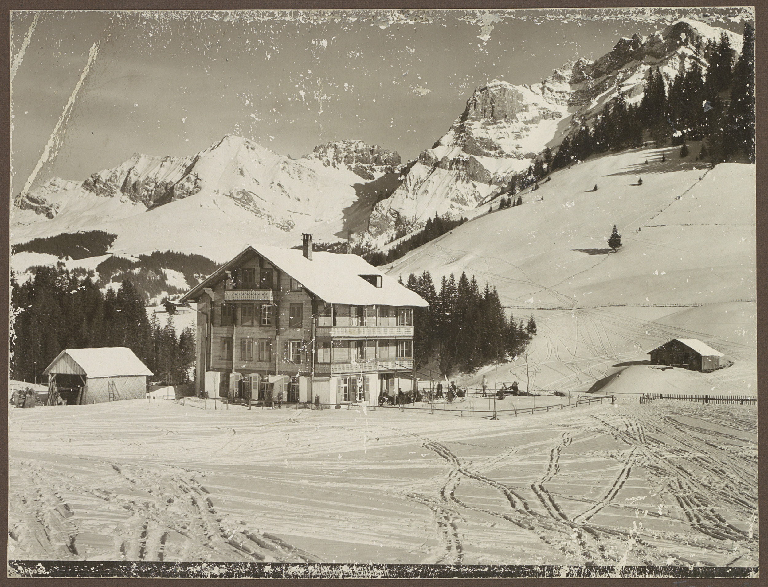 Gezicht op een chalet in de besneeuwde bergen van Gi...