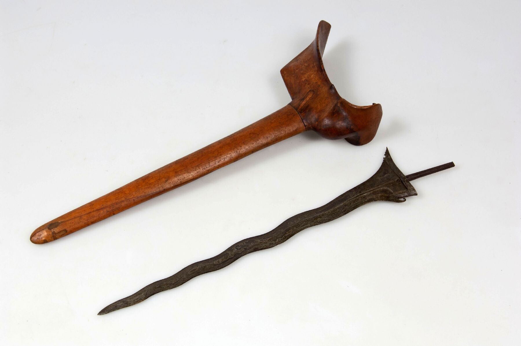 Zwaard met een gegraveerd lemmet en een houten, gehe...