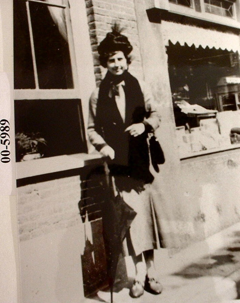 Mevr Loes Jeurissen op de foto voor de winkel van Ge...