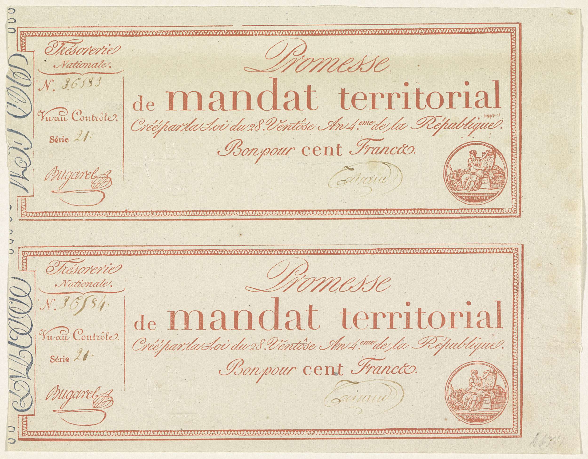 Twee promessen van 100 frank, 1795-1796