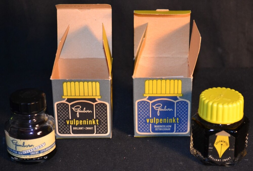 Drie inktflesjes van glas voorzien van pennenhouders...