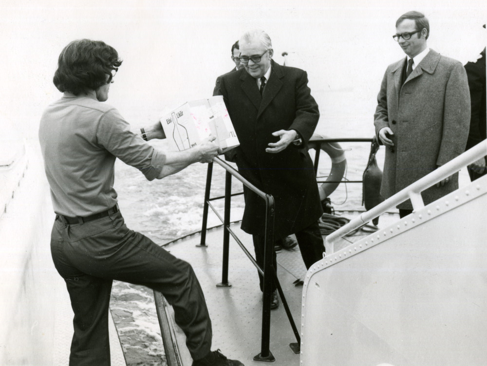 Zwart-wit foto van een bezoek van de commissaris van...