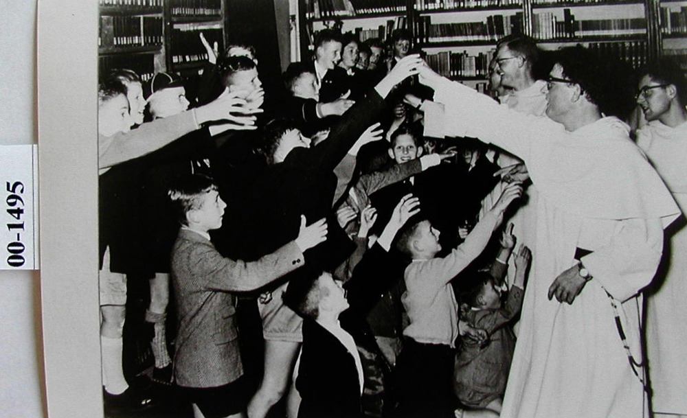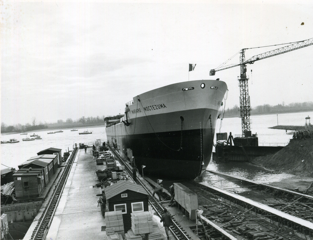 Zwart-wit foto van de tewaterlating van een schip bi...