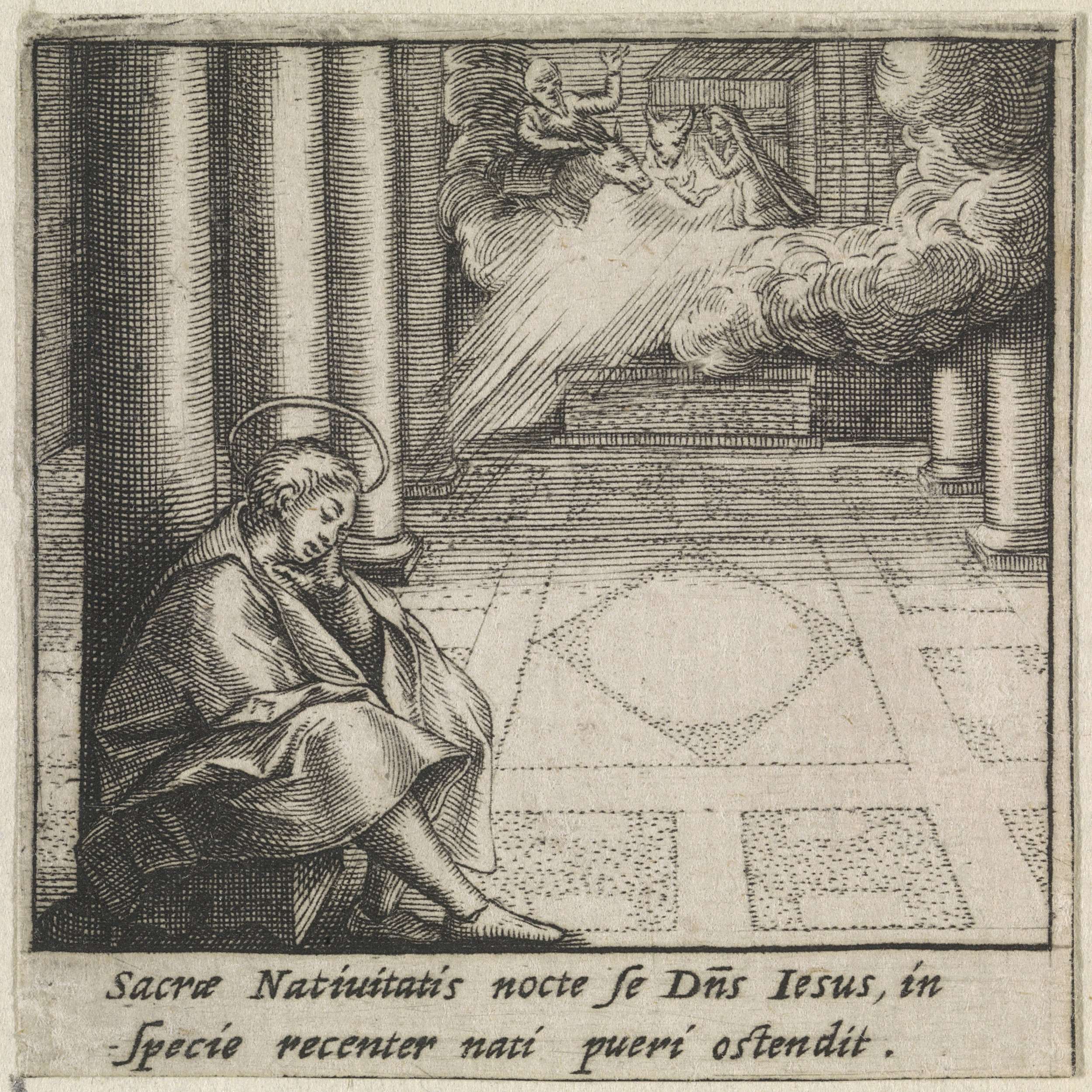 Slapend Christuskind in bed aanbeden door Maria
